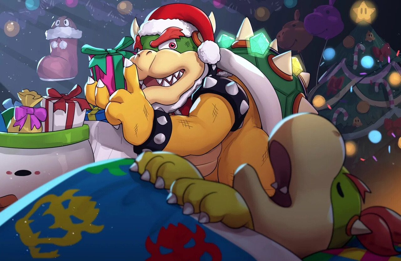 Когда все в замке заснули, Боузер тихо вышел из своей комнаты с коробкой в руках. Он надел красную шапку Санты – просто чтобы создать праздничное настроение.