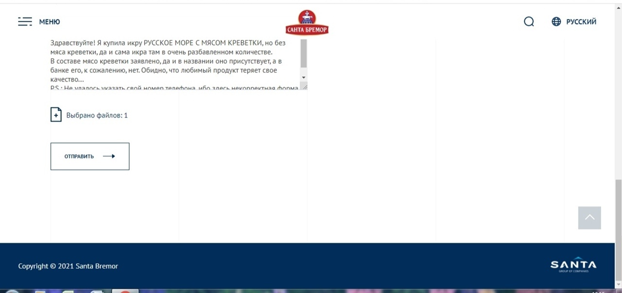 В следствие вышеизложенного, захотелось мне написать о своем разочаровании производителю. Вообще-то это не первый раз, когда попадается некачественный продукт, но я, как правило, не жалуюсь. А тут, видимо настроение что ли такое, или этот случай стал последней каплей в копилке разочарований, поэтому я зашла на сайт производителя и попыталась отправить им рецензию на их товар. Заполнила все поля, соблюла все условия, приложила фото (почему-то можно приложить только одно), и попыталась отправить, нажав на кнопку ОТПРАВИТЬ, а ничего не произошло... Не отправляется. Поэтому пишу здесь, видимо, чтобы просто закрыть этот гештальт, ну и еще для тех пикабушников, кто любит этот продукт - возможно моя информация им будет полезна...
