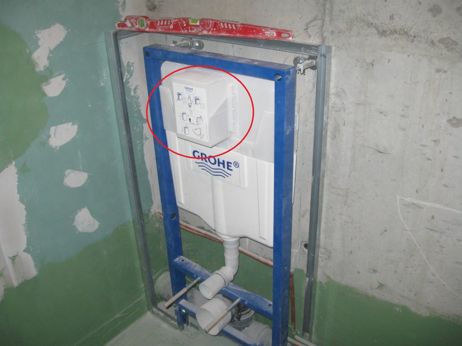 Вот эта пластмассовая штука обрезается уже после "чистовой" отделки по размеру (пример - плитка уже на стене). Это защитная коробочка, что бы мусор внутрь не залетел. В 99% случаев там уже готовые места, для подсоединения рамки с кнопками слива воды. Монтаж этой кнопки очень прост.