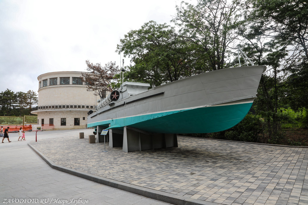 Торпедный катер проекта 123К «Комсомолец» в уличной экспозиции, а за ним, как раз, здание Диорамы.