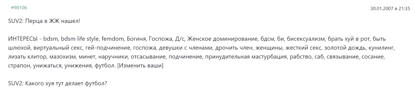 Ну и на десерт - «Можете гордиться своей «молодецкой колбасой», своим красавцем, своим шлангом, но держите его там, где и ему и полагается быть. В трусах. Потому что ему ни за что не оказаться вблизи моей «штучки»».