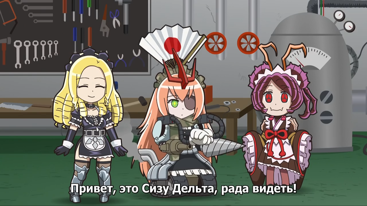 В общем в аниме Ple Ple Pleiades (Спешлах аниме) ( Если быть совсем точным это (Overlord) 7 серия (2015) Спэшлы) Плеяды решили "улучшить" Шизу и создали из нее "танк" с дрелью и пушками. Так вот, при нажатии кнопочки у нее вырастали телескопические руки и начинали терется друг об друга, а над головой появлялся веер с флагом Японии. Также менялась манера разговора от безэмоционального к более как сказать...ораторскому что ли. В нашем переводе было "Привет, это Шизу Дельта, рада вас видеть!" В оригинале она говорит типа "Хайто мас Шизу Дерута дес" и так далее что то, при этом разговаривает немного дергано и дергается на месте будто постоянно оборачивается.