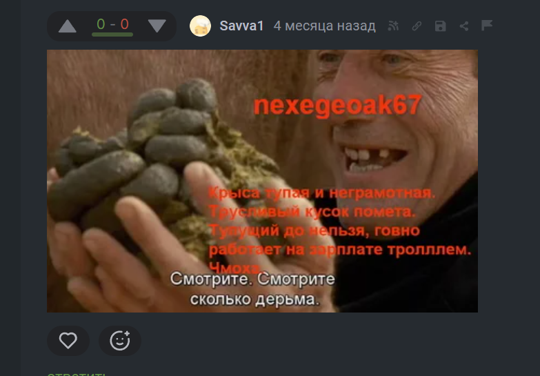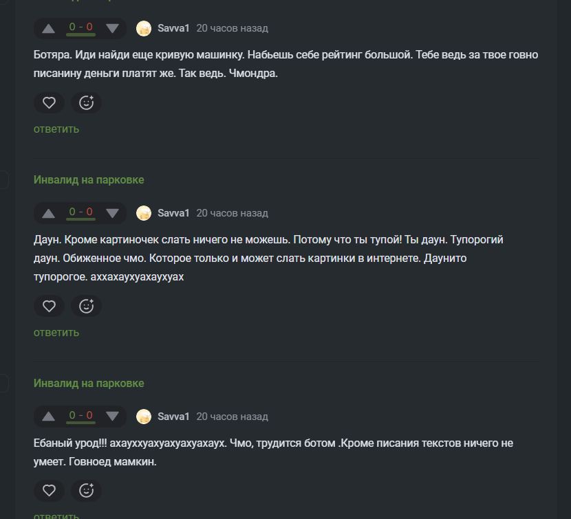 Это чудо, когда выходит из дурки или кончаються таблетки строчит по 40-50 ответов за раз .И все из за того ,что я усмонился в его адекватности. Ниже это еще "добрые коменты" от жертвы сталкера за сегодня-вчера ,длиться это уже почти год, идиот присылал фикалии , угрозы смерти, угражал разборками с братвой и т.д