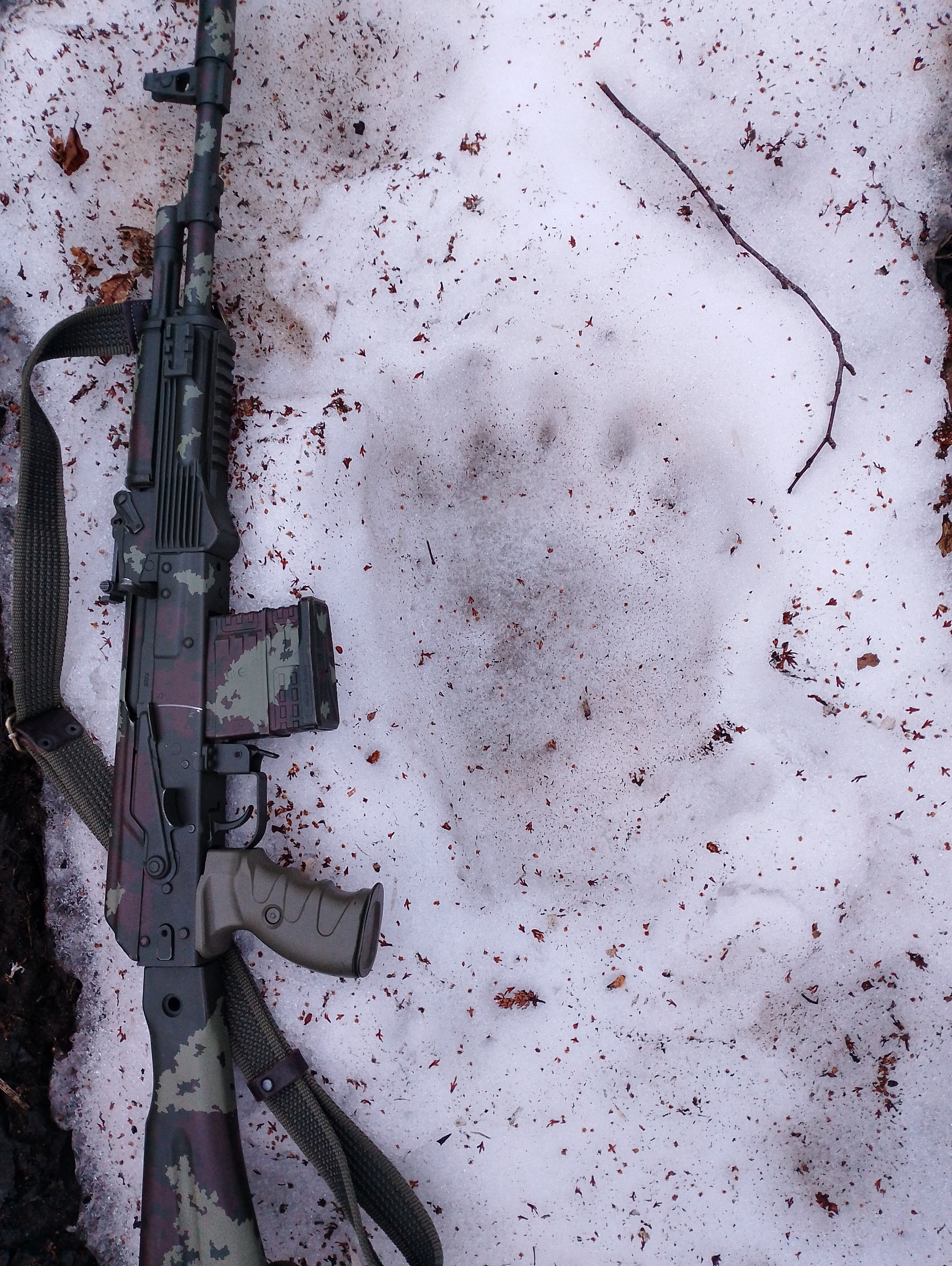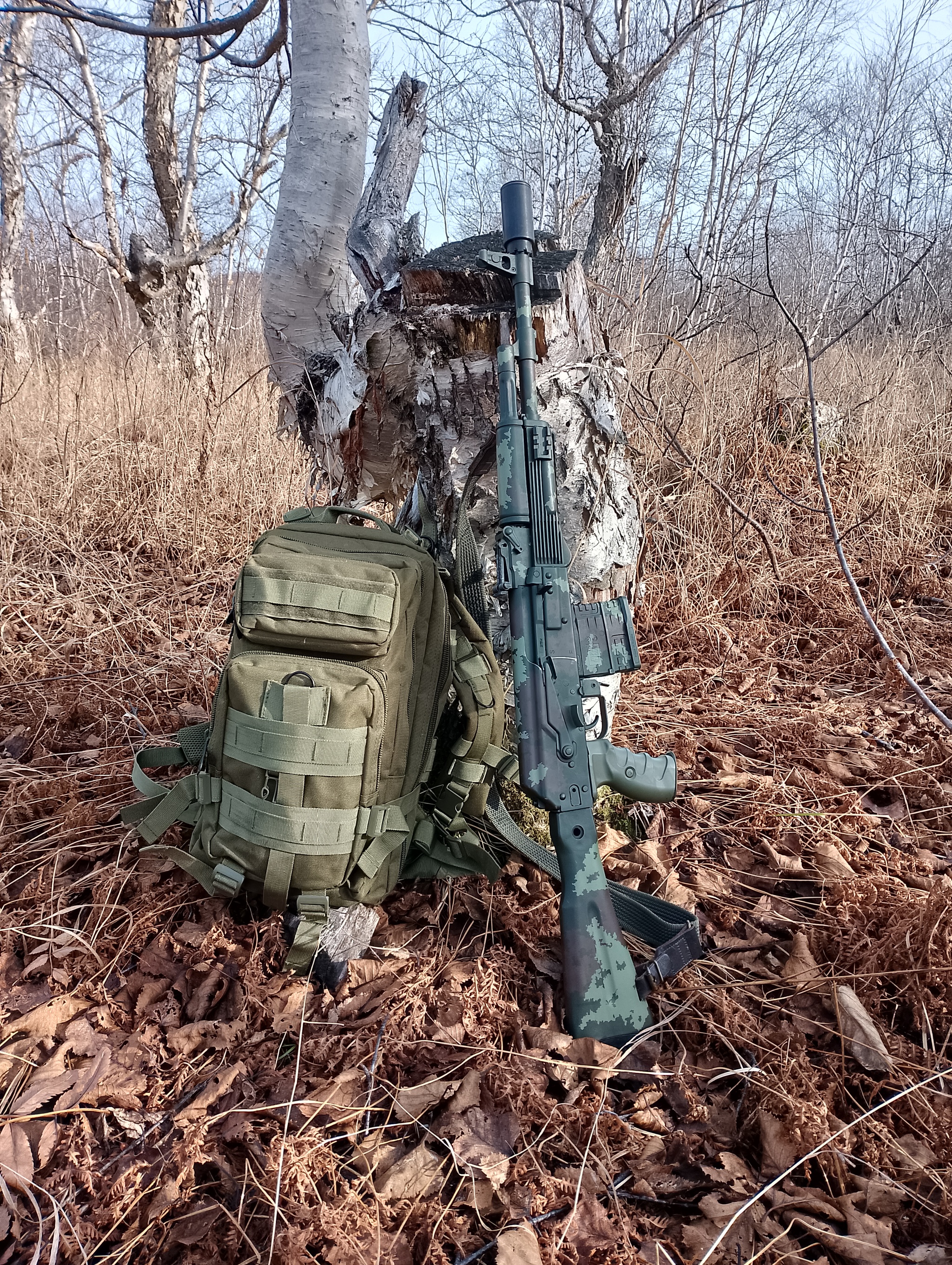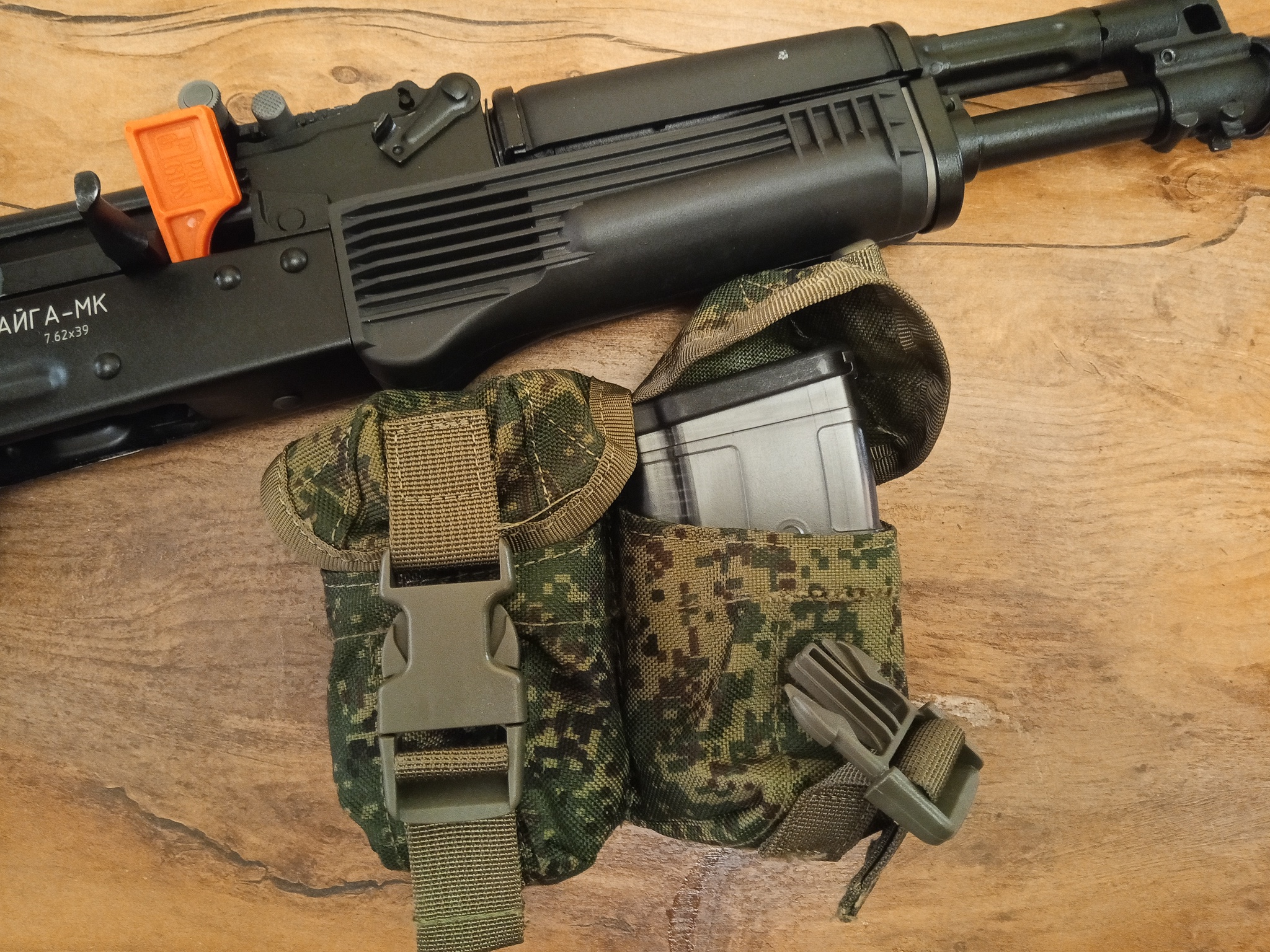 Моя Сайга-308-1 в камуфляже от производителя краски "Тайга" и с пистолетной рукоятью от АК-12 первой серии.