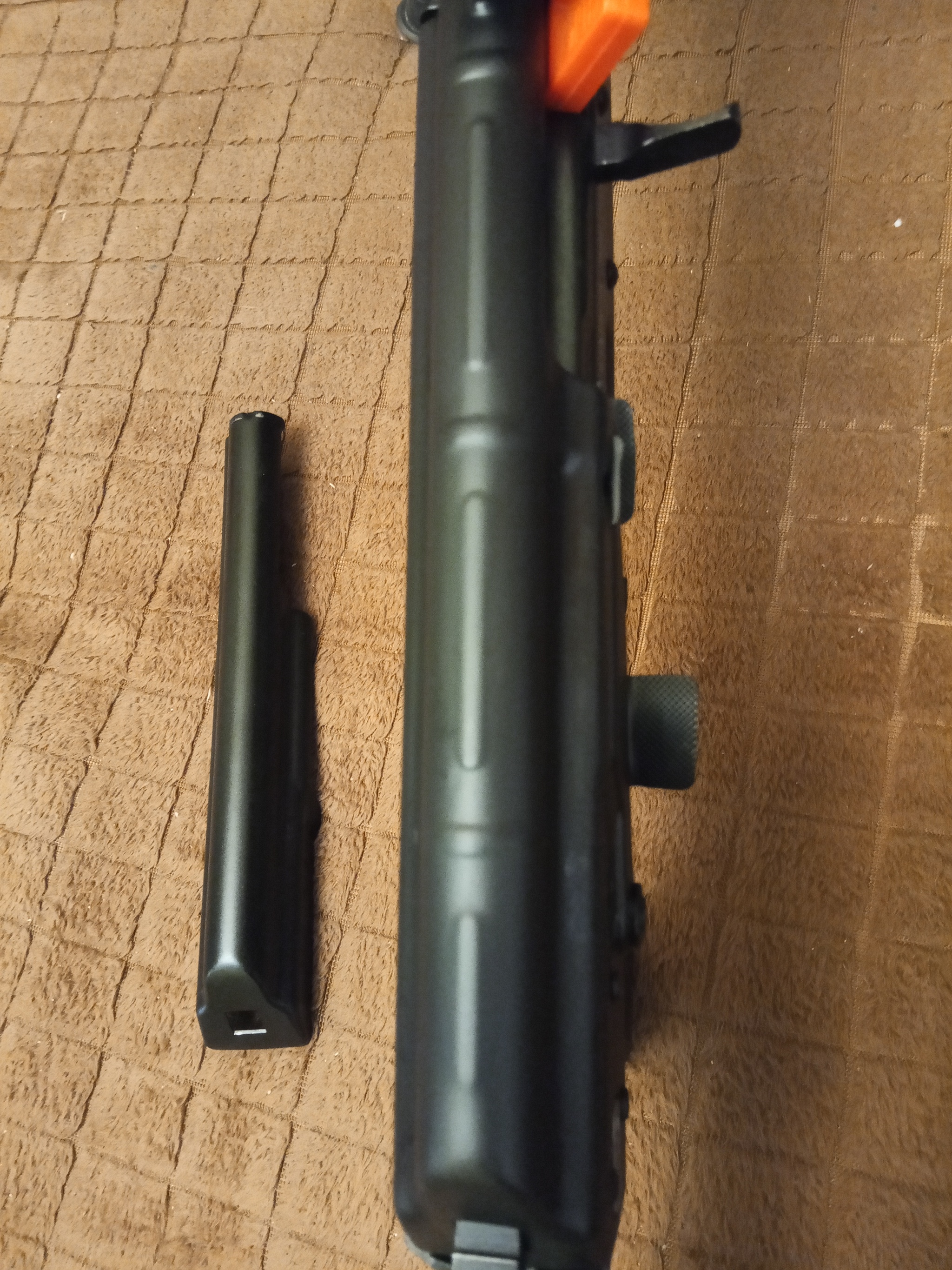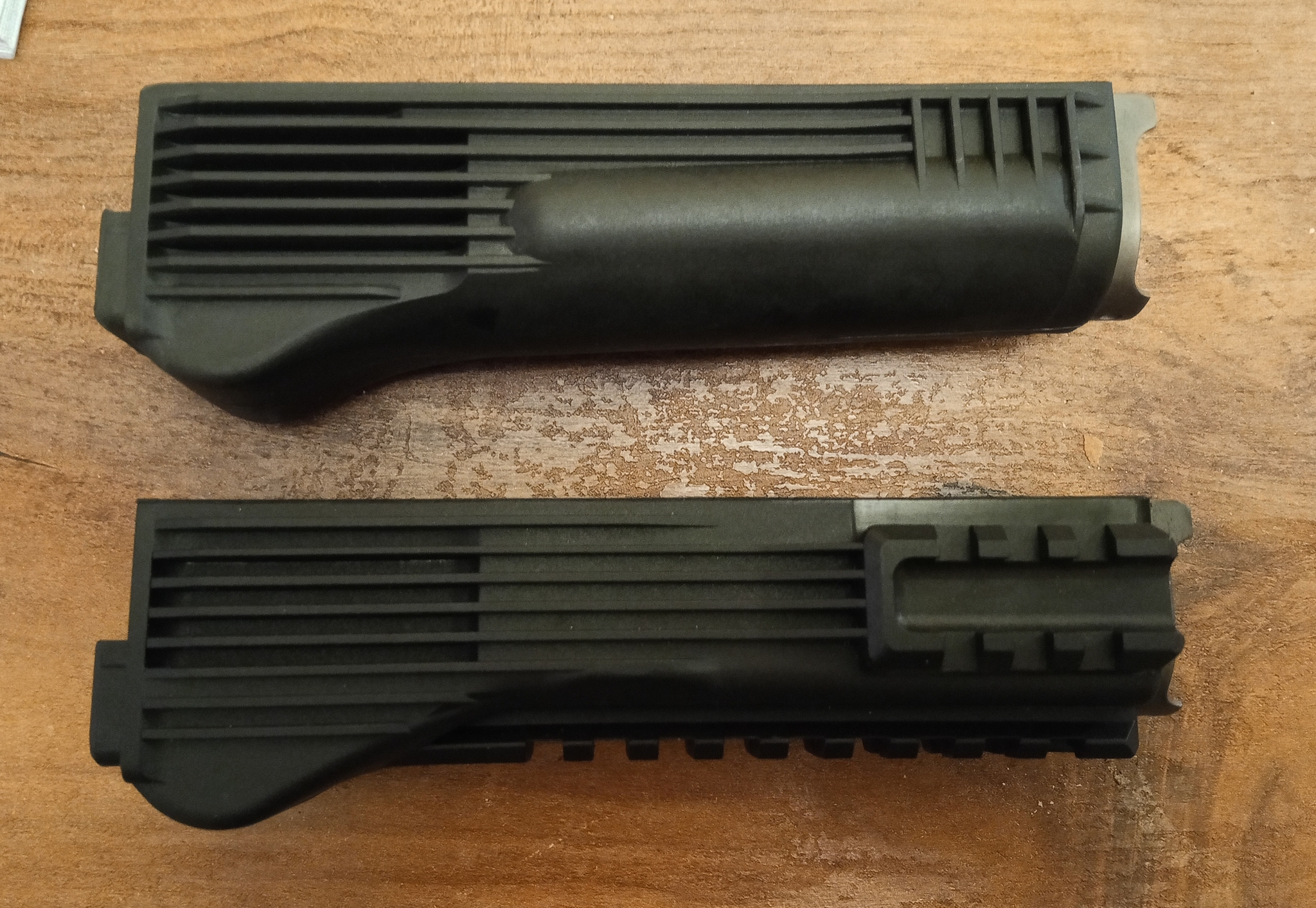 Следующим шагом была замена цевья - "брутальное" и неудобное цевье с двумя планками Пикатини, мешающими удержанию оружия, я пюзаменил на обычное, гладкое цевьё, как на боевом оружии времен моей службы. Новое цевьё встало на место чётко. И даже практически не отличается по цвету со ствольной накладкой.