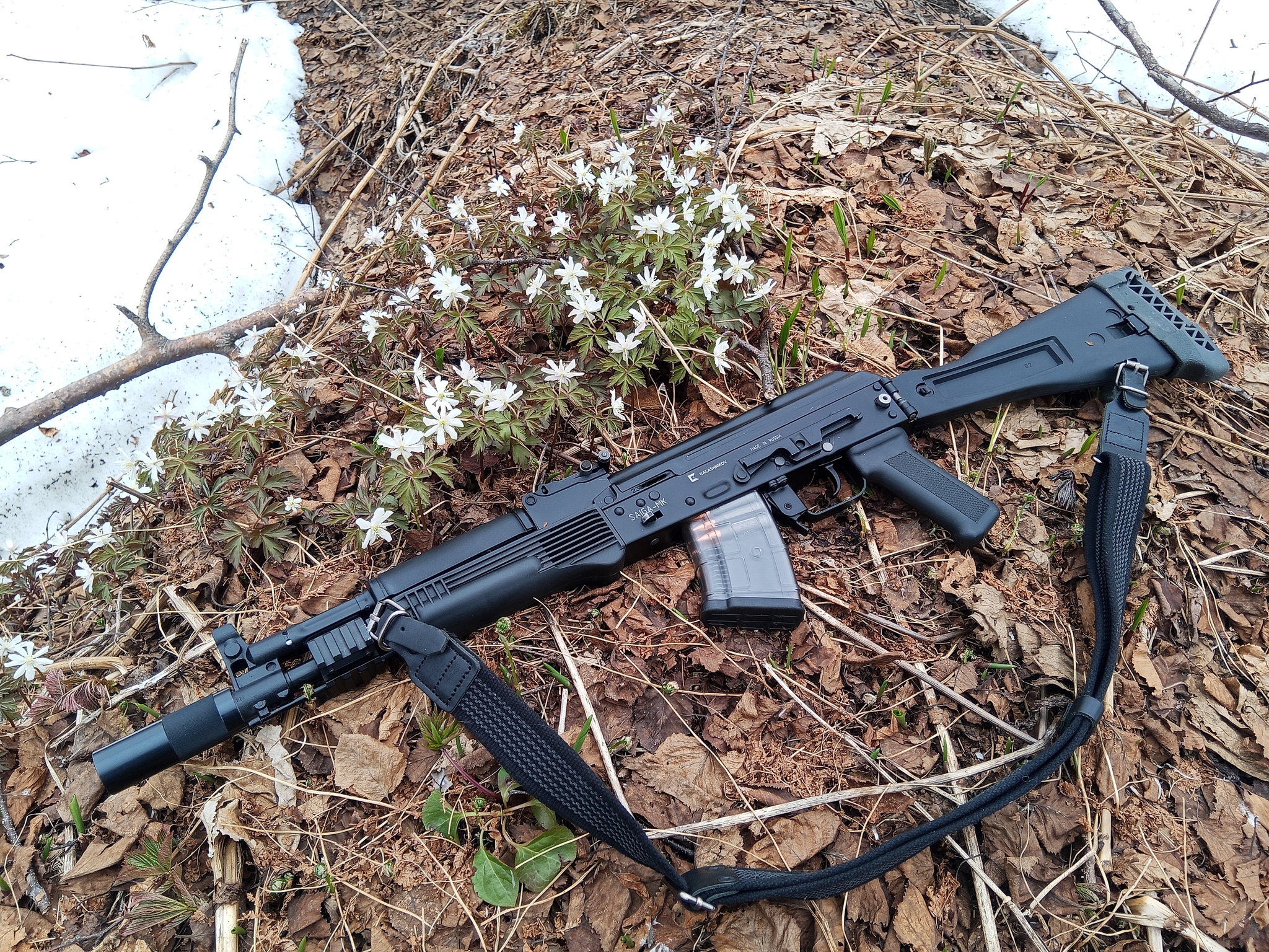 Носить в лесу Сайгу в исполнении 033 со стволом длиной 341 мм очень удобно. Ствол за спиной относительно короткий, он не цепляется за ветки деревьев в густом лесу или кустарнике. Не удобно только то, что ствол в этом оружии выступает наружу относительно резьбы для ДТК. Сделано это для соответствия закону об оружии. По этому, при подборе дожигателей или ДТК, необходимо искать те, которые изготовлены именно для Сайги в исполнении 033. ДТК для других моделей Сайги вы не накрутите - выступающий ствол не даст.