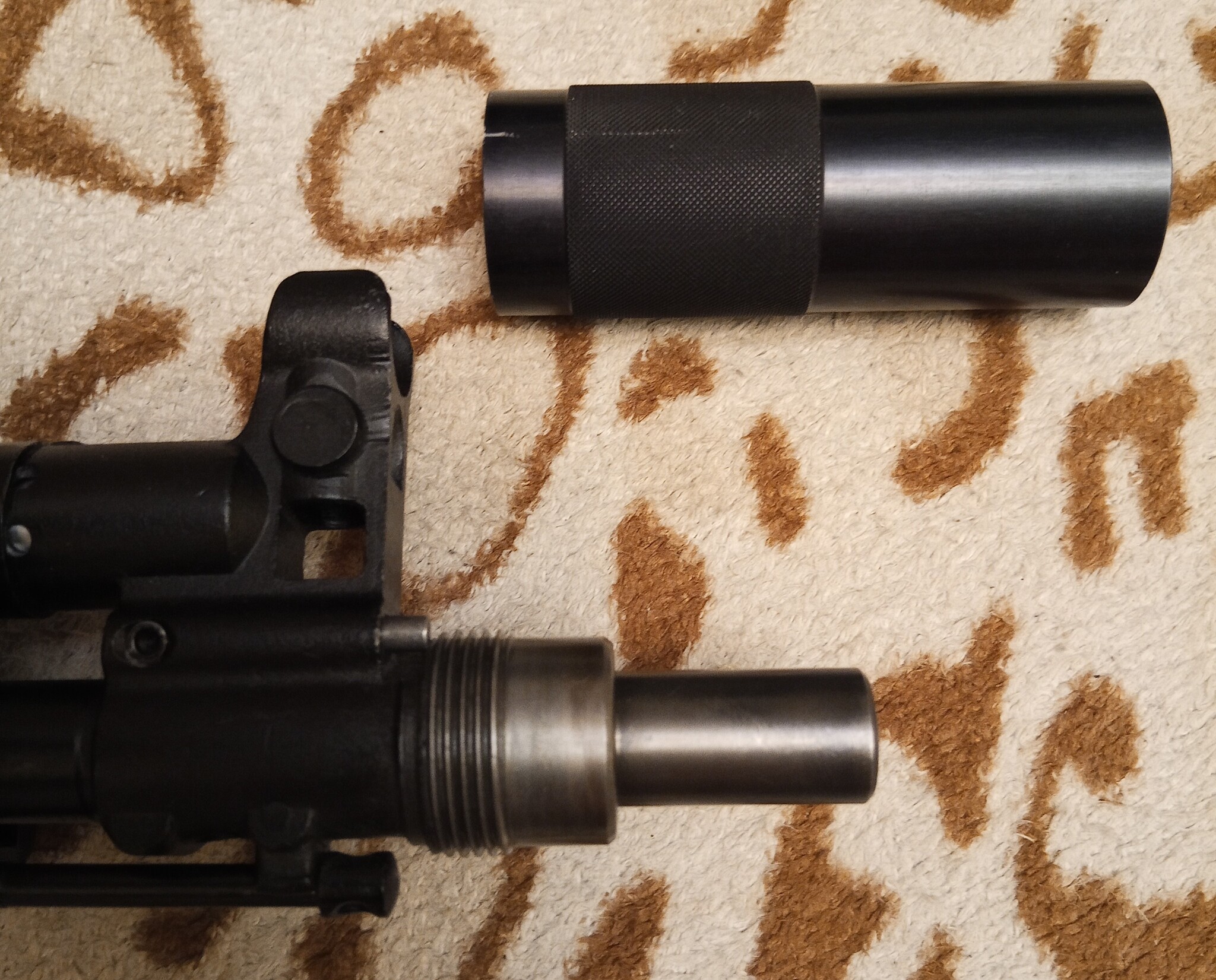 На этом весь функциональный "тюнинг" был закончен. Но я ещё установил две "хотелки" - одна из них это цилиндрический "колпачок-дожигатель" вместо штатного ДТК. Ну не нравится мне ДТК от АКС-74У, которым комплектует завод. Выстрел на охоте с колпачком относительно не громкий, а при спортивном использовании этого оружия, если большой настрел за тренировку, наушники обязательны.