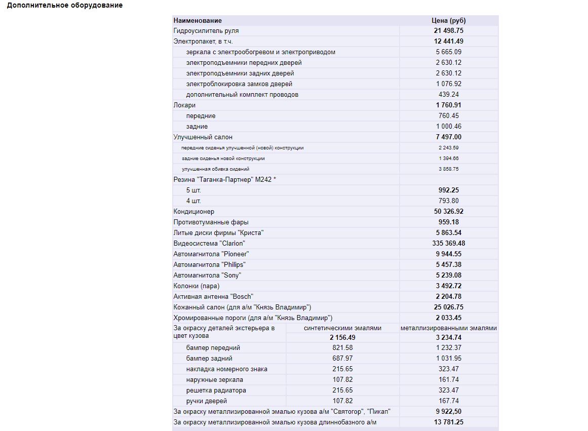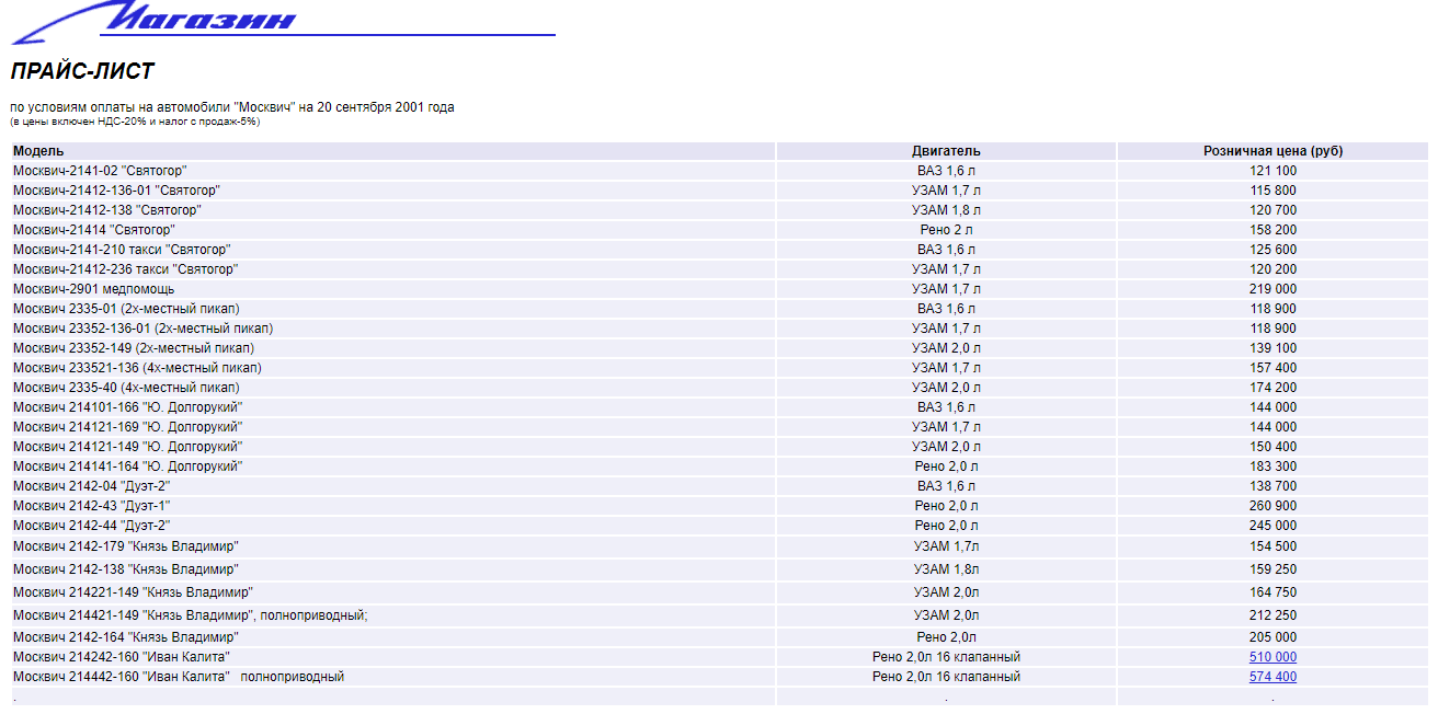 решили поглядеть почём машинки... (цены обновлялись аж в 2001 году)