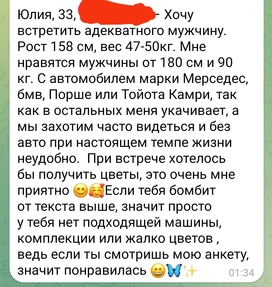 Её рост 158, хочет парня как обычно от 180. Ну тут в принципе хрен с ним, всё норм, она не требует, просто пишет, что нравятся парни выше, не значит что откажет тому кто ниже, да и высоким парням часто нравятся девушки пониже.