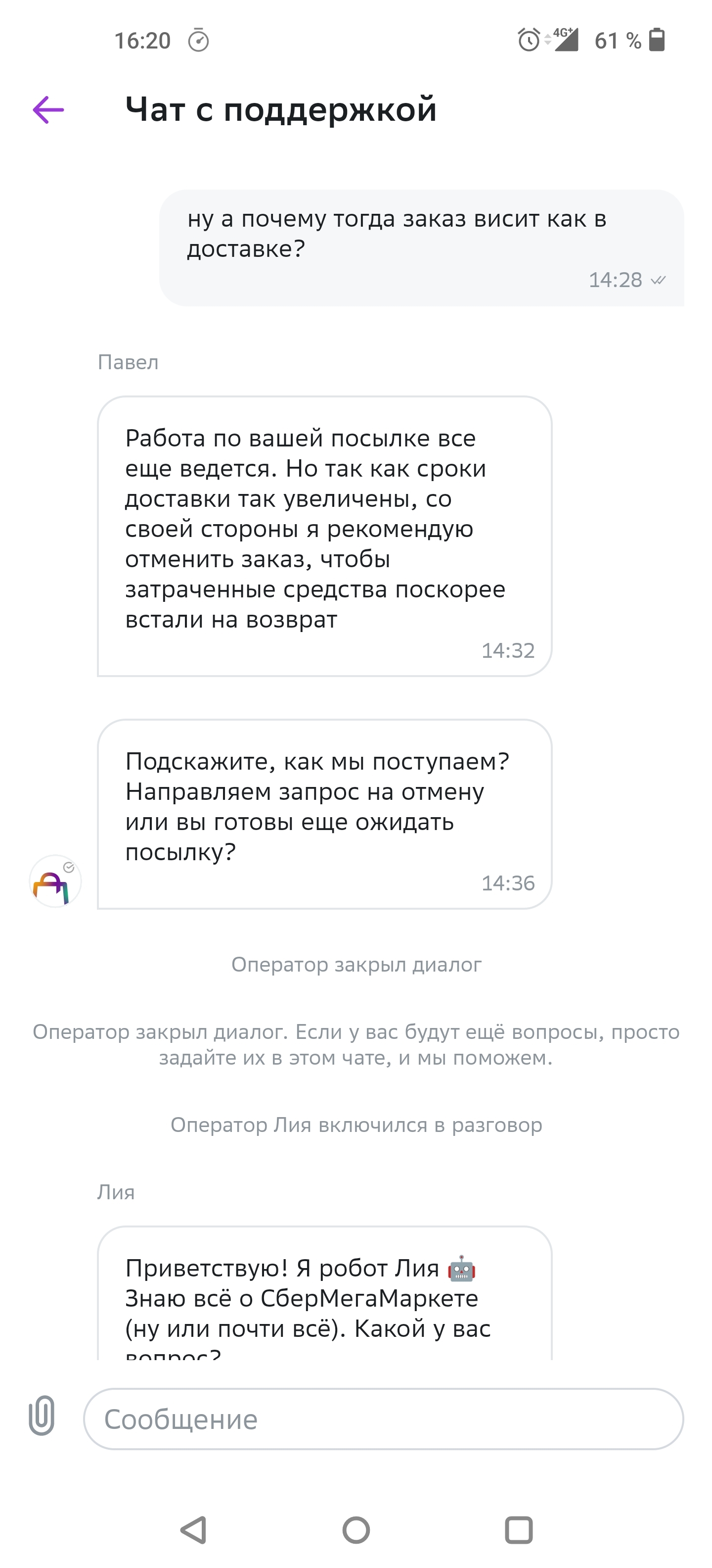 Сегодня уже решил обратиться в поддержку по вопросу ,что с моим заказом ,сроки все вышли а он ещё катается.Ну и поддержка сбермегамаркета просто предложила отменить его,мол наверное что то пошло не так.