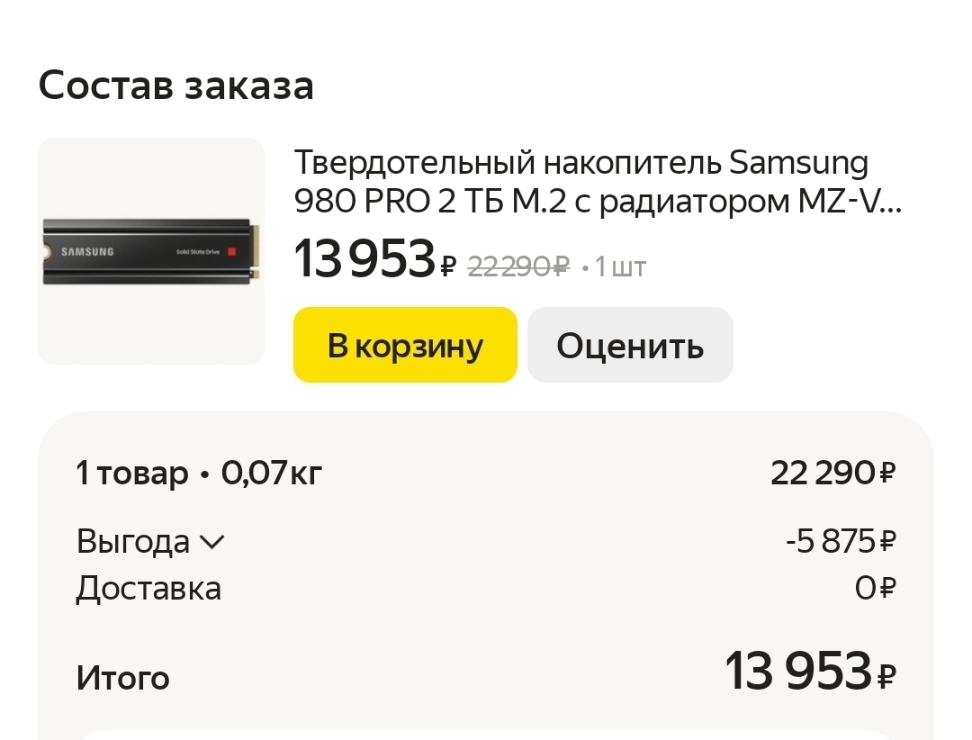 На прошлой неделе заказал себе на Сбер Мегамаркет SSD M2 Samsung 980 Pro 1Tb у продавца Мегамаркет Москва: