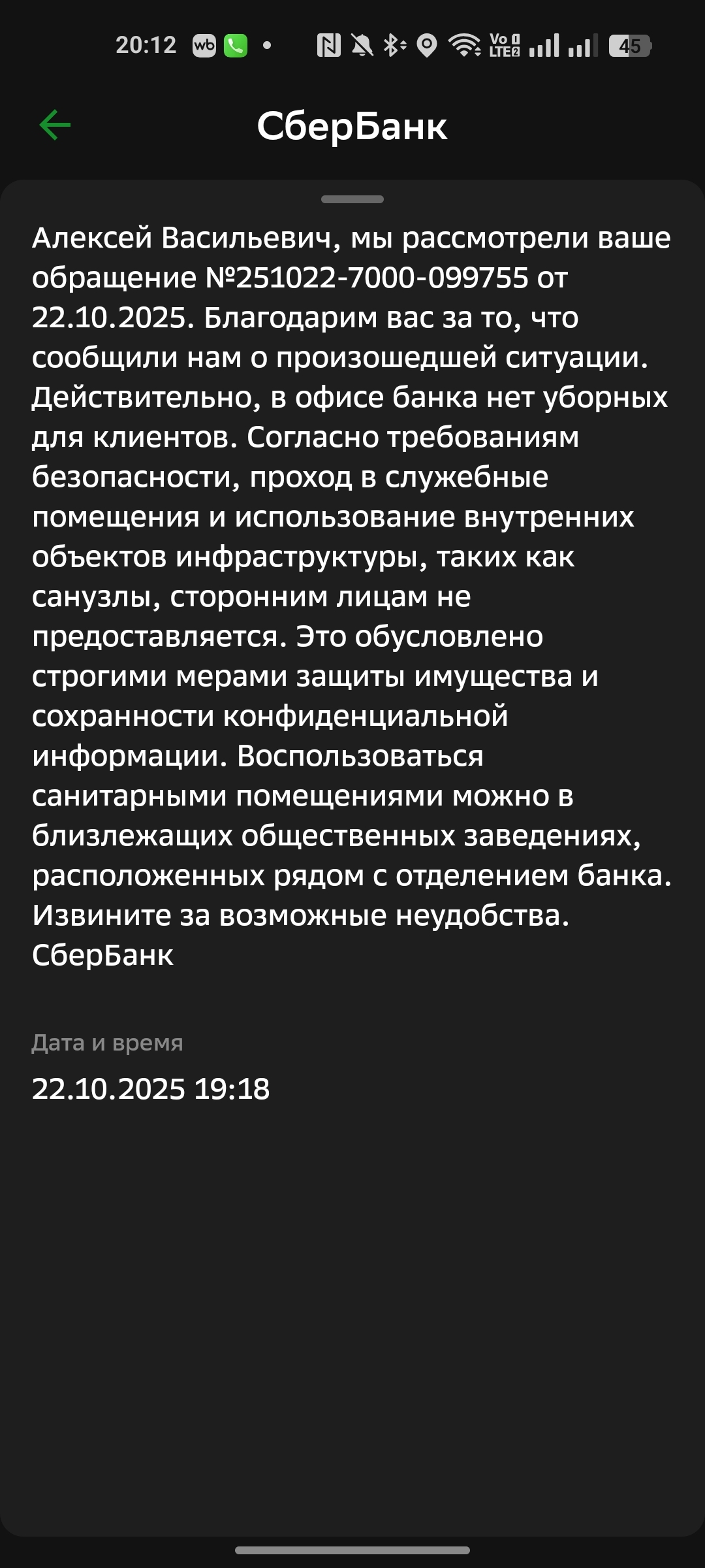 Добрый вечер уважаемые! Поделюсь тем, что беспоклит. Сегодня были с отцом в Сбере, денежку снять, отец 74 года, болен, рак предстательной, постоянно позывы в туалет. Эти гады отказали старику, он ушел ни с чем, и даже не в сухих штанах. Вот такие у нас банкиры, и их рнкомендации обращения с людьми. На мои маты, был ответ - не положено, меры безопасности. Подробнее - это Республика Адтай, село Чемал. Дед - явился угрозой. Затем было обращение с притензией в чат, и обратным обещанием ответа по проблеме. Вот ответ -