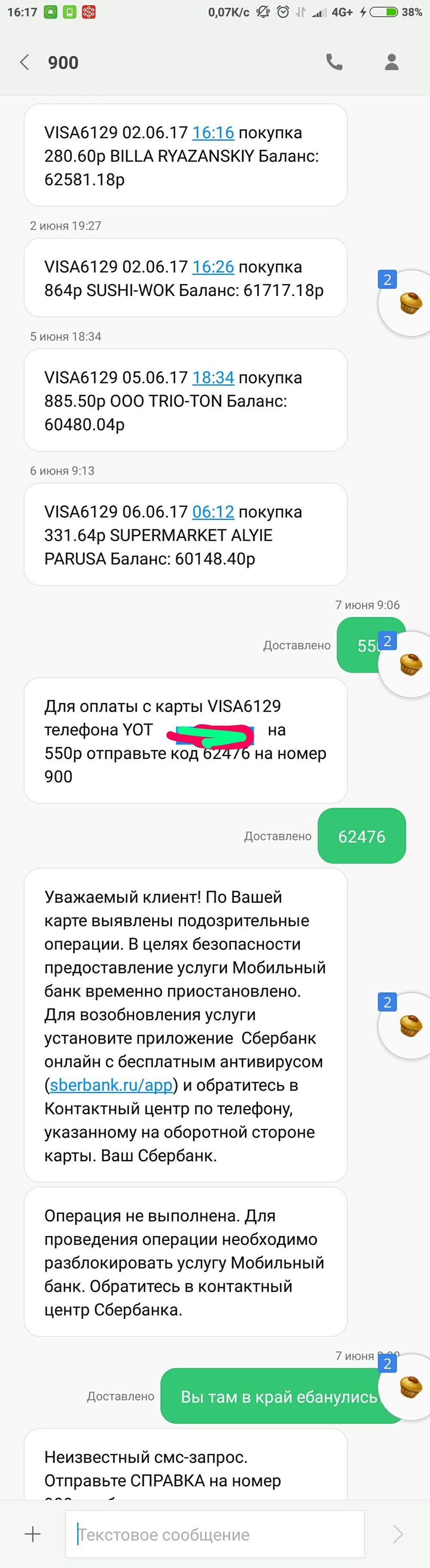 Положил себе деньги на счёт через мобильный банк (номер 900, привязана одна карта и один номер телефона). Отправил команду "550", пришла ответная СМС с кодом подтверждения, отправил корректный код и... Эти пидорасы заблокировали меня с подозрением на мошенничество. Дня 4 не было активности по карте, все было нормально. А тут... Пидорасы.