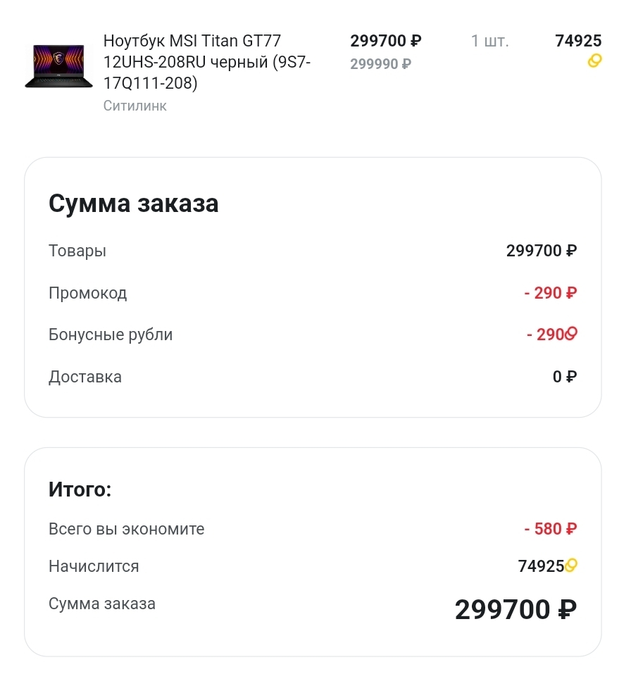 Выбор был сделан ещё в прошлом году, но цена кусалась, 412к. Рублей за MSI Titan GT77. Скидка действительно была приличной ноутбук вышел с ней 299.700, ну и кэшбэк бонусами 25% от суммы покупки тоже довольно не плохой))) Но не в этом суть...