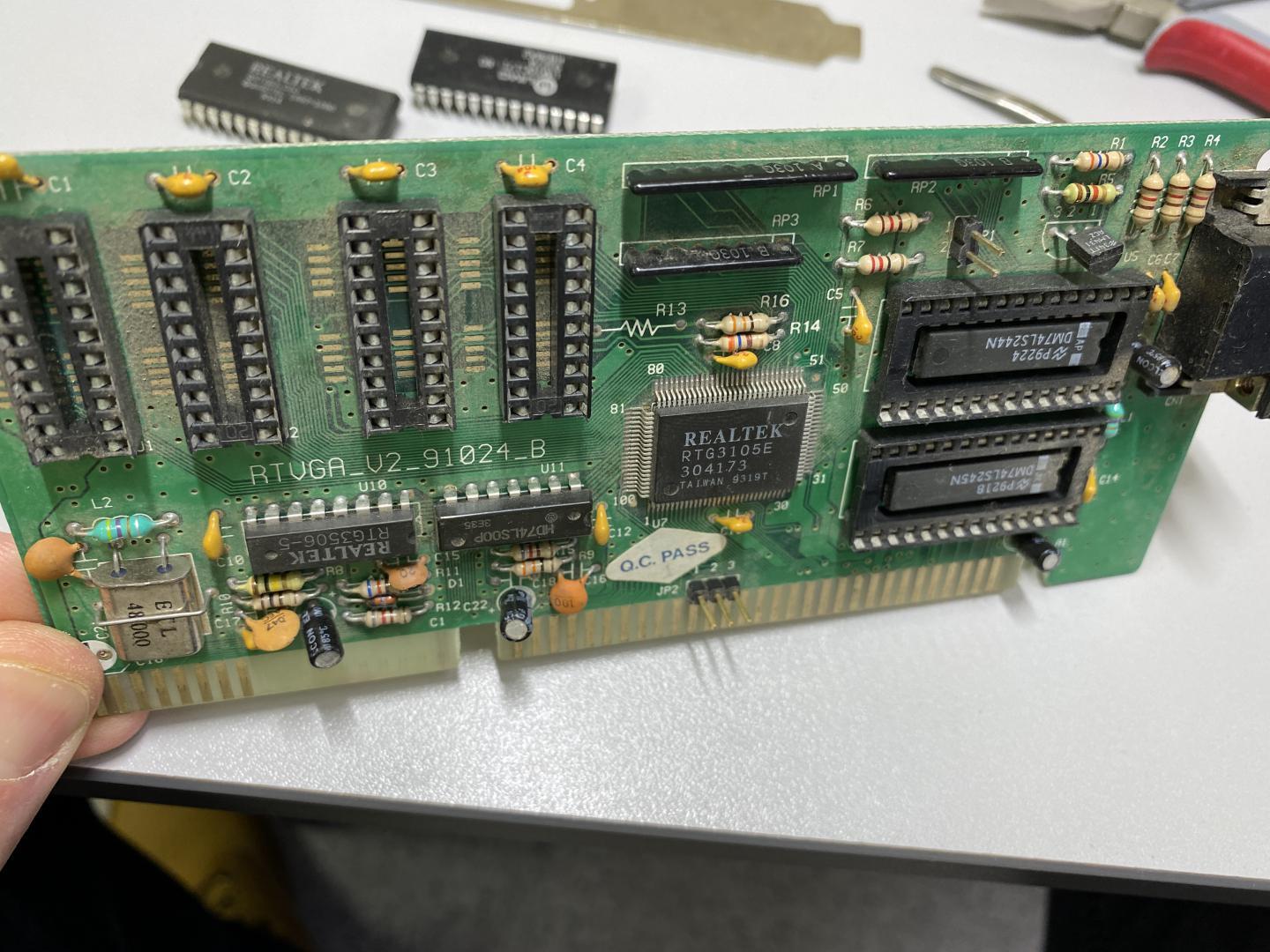 Тестовый стенд получился весьма удобным! Кстати, первый запуск делали вместе с отцом – ПОИСК-2 это его молодость, недостижимая мечта студентов Таганрожского Радио Технического Института, в котором он учился в 80-х. Обрадовавшись окончанию затянувшейся эпопеи со сборкой, мы подготовились к запуску. Естественно, Traident 9000i не запустился даже в 8-битном режиме (видеокарта ведь ISA-16 хотя и с джамперами для работы в 8-битном слоте), пришлось срочно на Авито искать Realtek. В пределах 1000-2000р до сих пор можно найти вполне рабочие экземпляры, которые несмотря на 16-разрядный ISA слот, вполне работоспособны и в коротком, 8-разрядном. Это полноценный 2D ускоритель, с 256Кб видеопамяти и 256-цветовой палитрой. Самое «ОНО»!
