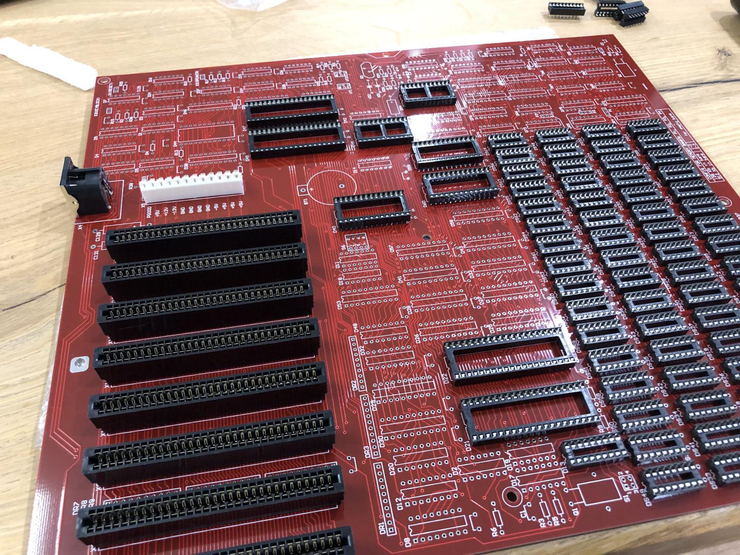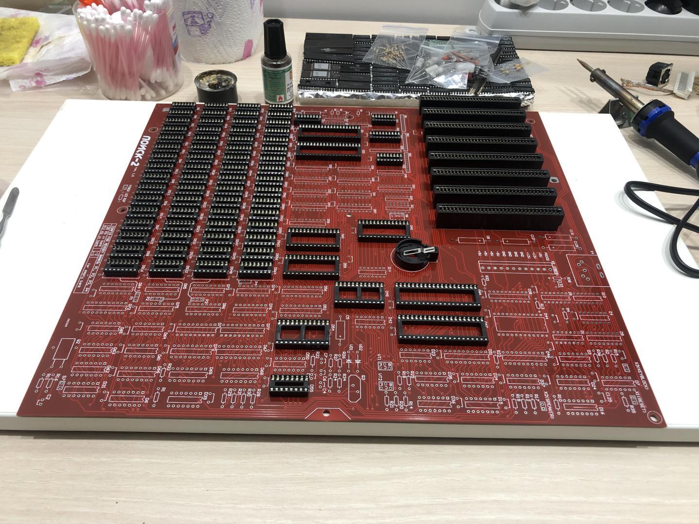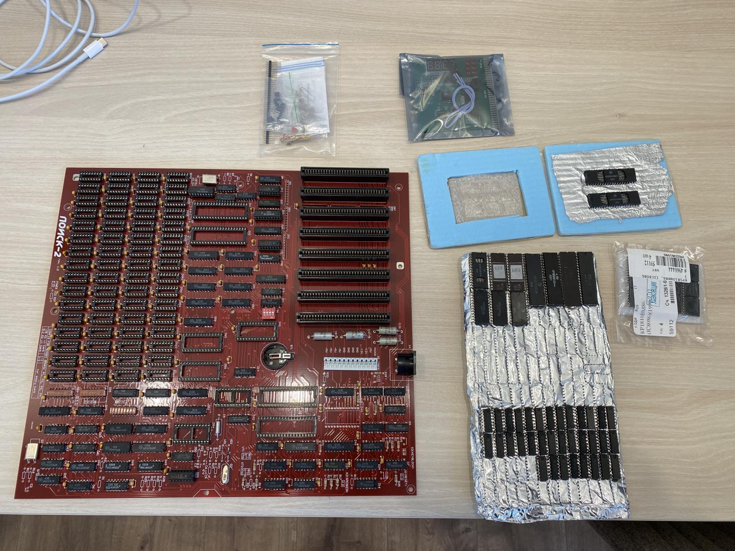 Итак, что предлагал продавец? Примерно за 12 тысяч рублей он продавал новую печатную плату красного цвета, изготовленную на заказ в Китае (оригинал, правда, был зеленый), полный комплект оригинальных микросхем, набор резисторов, конденсаторов, коннекторов и пластиковых панелек под установку чипов. Вместо многострадальных К565Р продавец положил аналог – микросхемы TMS425 зарубежного производства но тех же характеристик, всего 32 штуки по 32 Кбайт, или суммарно – 1 Мбайт. Жутко дорогой и редкий математический сопроцессор К1810ВМ87Б найти не удалось, вместо него в комплекте шел Intel i8087 – его прямой зарубежный аналог.
