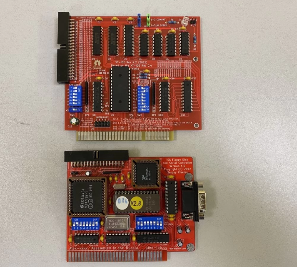 Вместо этого я приобрел довольно неплохие новодельные XT-IDE и XT-Floppy контроллеры. Такие железки обычно разрабатываются сообществом энтузиастов для подключения переферии к старым компьютерам. Да и цвет у них был подходящий – красного цвета, прямо под ПОИСК-2. Единственное – нужно было оба контроллера предварительно сконфигурировать. Поскольку у них свой БИОС, который перехватывает настройки оригинального БИОСа при загрузке, нужно было корректно выставить адреса на панели переключателей и загрузившись уже в БИОС самих контроллеров задать необходимые параметры загрузки накопителей. Продавец контроллеров подсказал в какую сторону копать, и после нескольких неудачных попыток получилось полностью сконфигурировать оба адаптера. Один – для подключения двух Floppy дисководов и COM устройств, второй – для подключения аж двух IDE HDD.