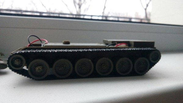 Вот собственно сам корпус модели. У него виниловые гусеницы, а внутри находится небольшой электро моторчик, который работает на пальчиковых батарейках.