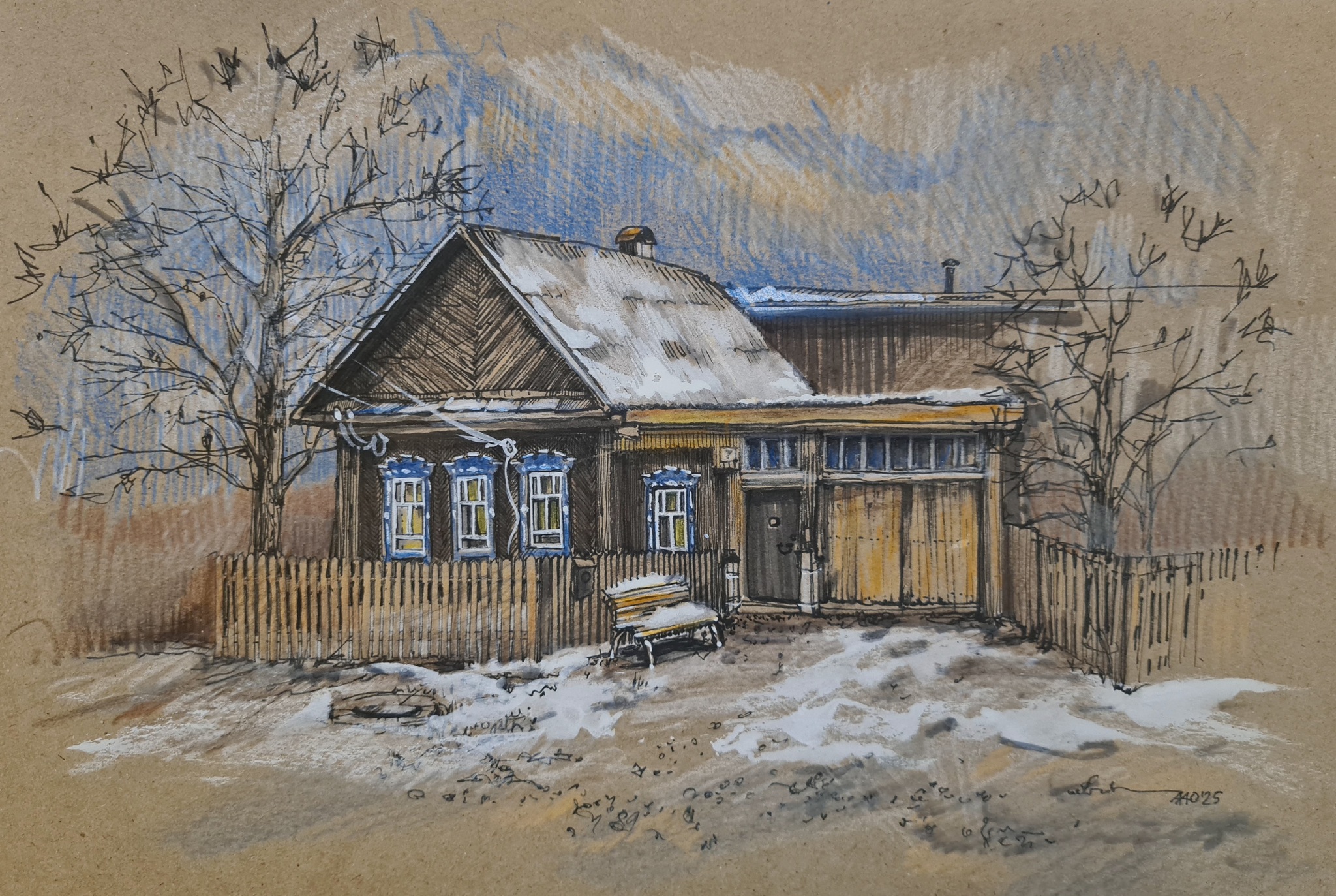 Рисовала домик по четырём фото и одному видео. При чем фото были разных сезонов, фрагментами периферия и сам домик целиком. Интересный эксперимент!