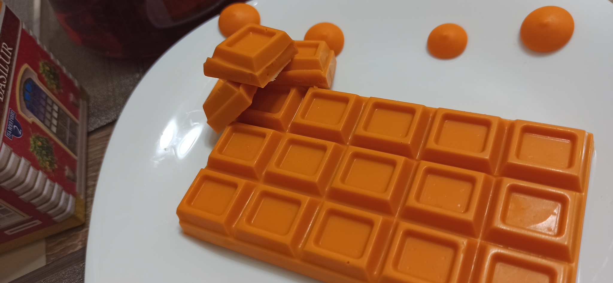По сути - это классический белый бельгийский шоколад, только апельсиновый. С натуральным красителем Е160е.