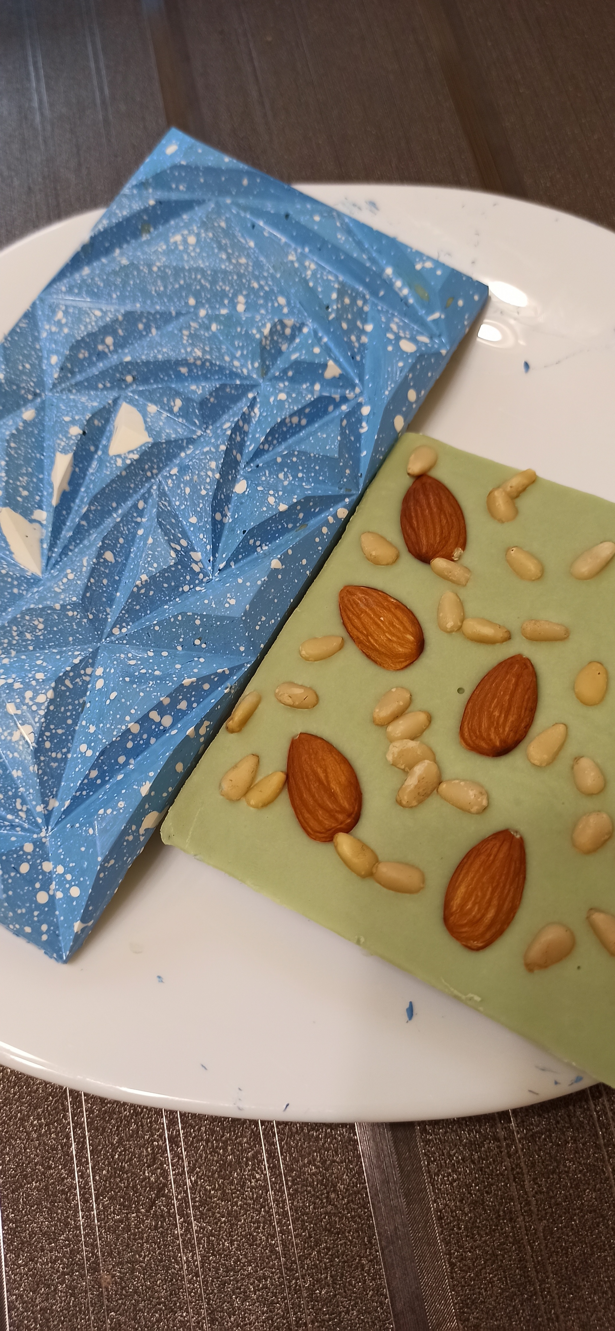 Импульсно в микроволновке по 15-20 секунд или на водяной бане. Разогреваем до 45 градусов. Далее добавляем те 30% отложенных каллет, мешаем до однородности и чтобы все расплавилось, замеряем температуру. Обычно она будет в районе 29-30 градусов. Нагреваем до рабочей температуры (белый шоколад 31 градус, чёрный и молочный 32-33). Все, можно разливать по форма