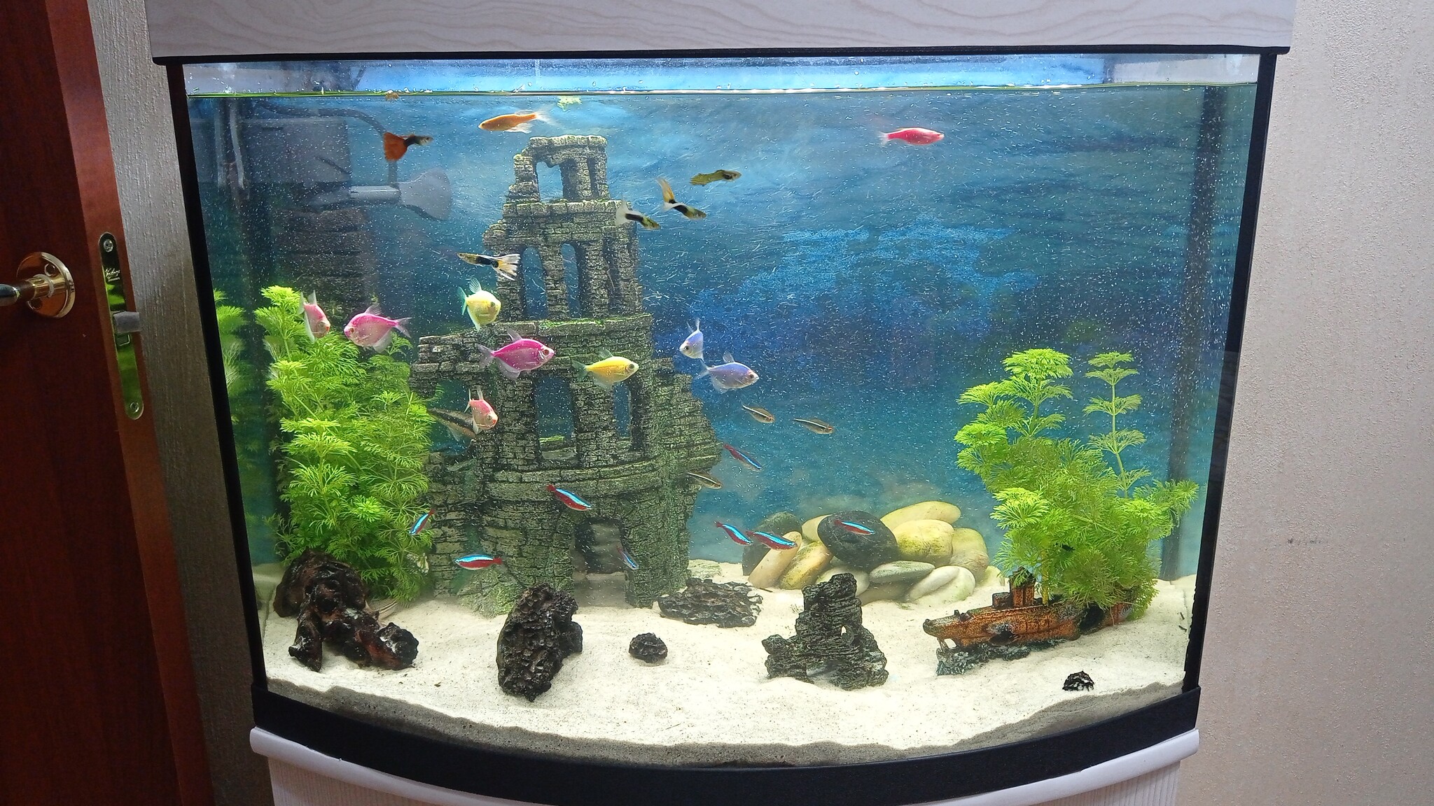 Недавно убрал роголистник. Надоел, раньше сиамские водоросоееды ели, сейчас не справляются. Это мой 140 л, после уборки. Живут, данио, самцы гуппи, неоны, голубые, красные и чёрные, тернеции, коридора сын и ансцитрусы. Ну и креветосы Блю Дрим. Из неудобств, растут водоросли на стёклах, при уборке снимаю пластиковой картой. Подмены 20 литров два раза в неделю. Фильтр тетра, внутренний.