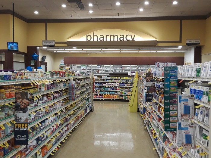 Фотка нашей аптеки. Непосредственно рецептурный отдел расположен за последним стеллажом прямо под надписью Pharmacy. Они там забаррикадированы так, что их не видно. Для доступа к людям есть окошко-прилавок.