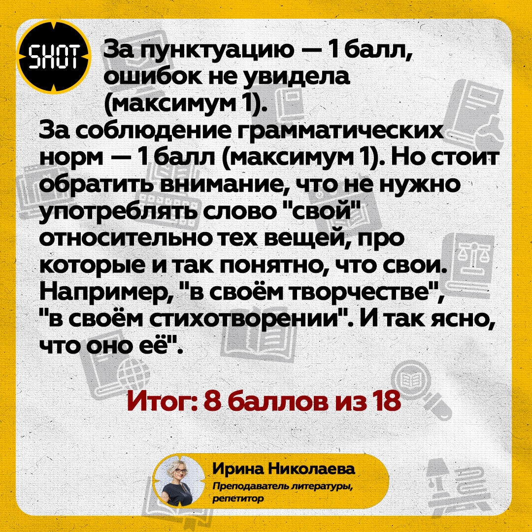 К сожалению, ChatGPT не удалось пройти экзамен для одиннадцатиклассников. Преподаватели назвали работу очень поверхностной, с большим количеством воды и выдуманными фактами о поэтессе. Из положительного лишь то, что искусственный интеллект отлично справился с пунктуацией и орфографией, что отметили преподаватели.
