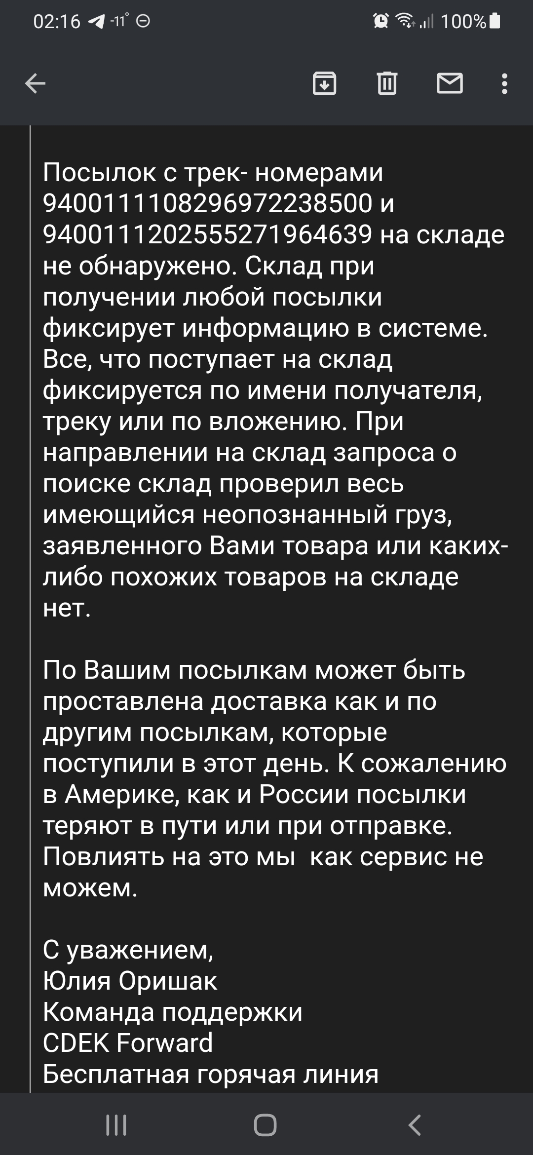 Я написал в СДЭК, мне ответили, что "в 16.29 грузовика доставки у них не было, искать ничего не будем, пишите продавцу". Написал продавцу, ему естественно особо не интересно чем-то заниматься. Открыл спор, ожидаемо проиграл, т.к. есть трек, который показывает что посылка была доставлена. Итог: потеряны деньги, потеряна посылка. 3000, но обидно.