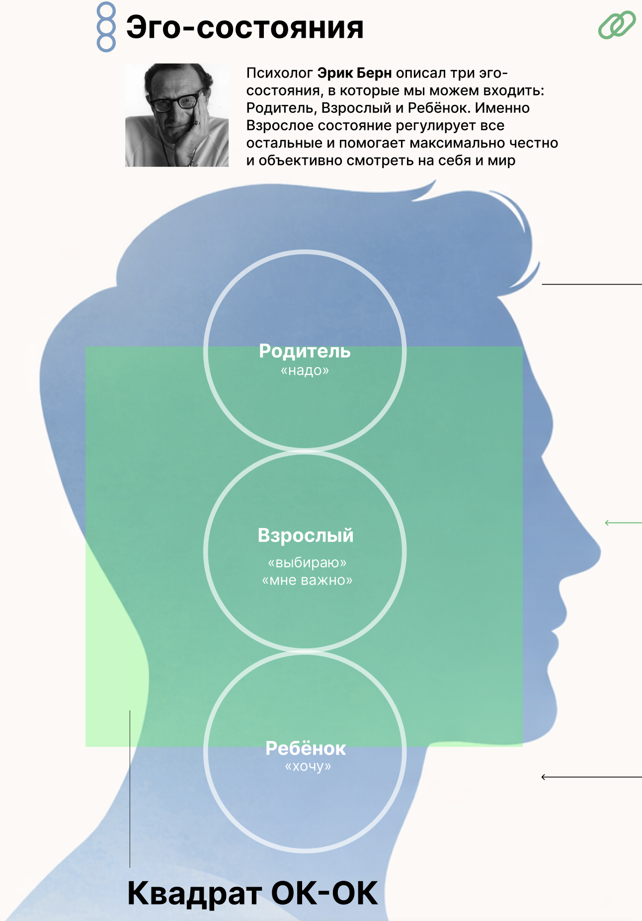 Левая часть плаката — так называемые эго-состояния, из которых мы можем общаться и принимать решения. Всего их три: