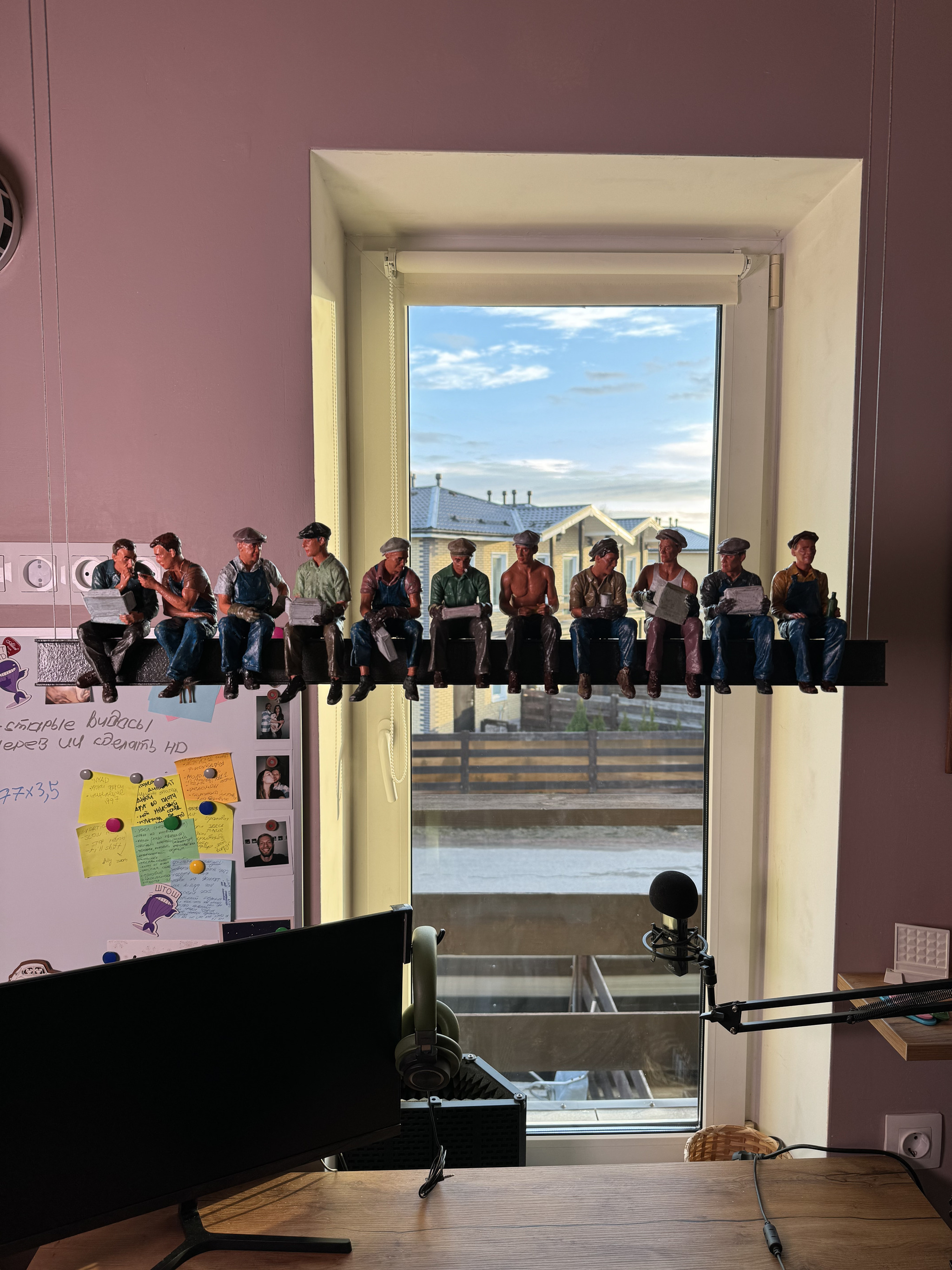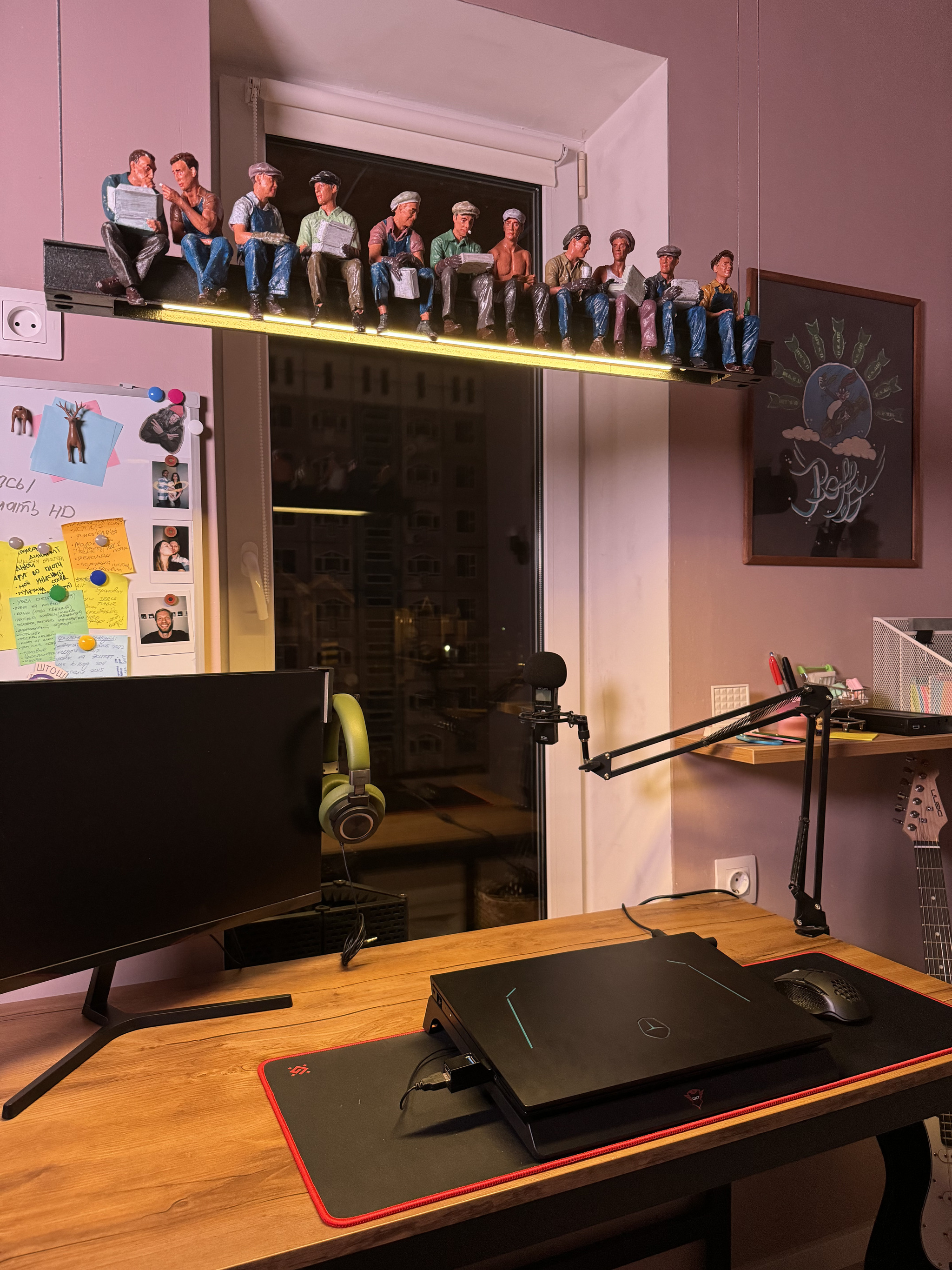 пс.. возможно кому-то мало инфы в видео, поэтому по материалам и технологиям: все сделано на зд принтере из АБС пластика. Далее грунт и покраска акриловыми красками вручную. Для крепления строителей в задницы клеил магниты неодимовые, а в балку пропихнул самодельный профиль сваренный из двух уголков нержавейки (да, некоторые сплавы - магнитятся). Тросики покупал на маркетплейсе, они используются для подвешивания фитоламп над цветами и в комплекте сразу идуь всякие замочки и крепежи. Сам светильник беспроводной, стоил около 2к - хватает на 4 часа непрерывной работы (для зарядки светильник вынимается - держится на заводских магнитах внутри корпуса)