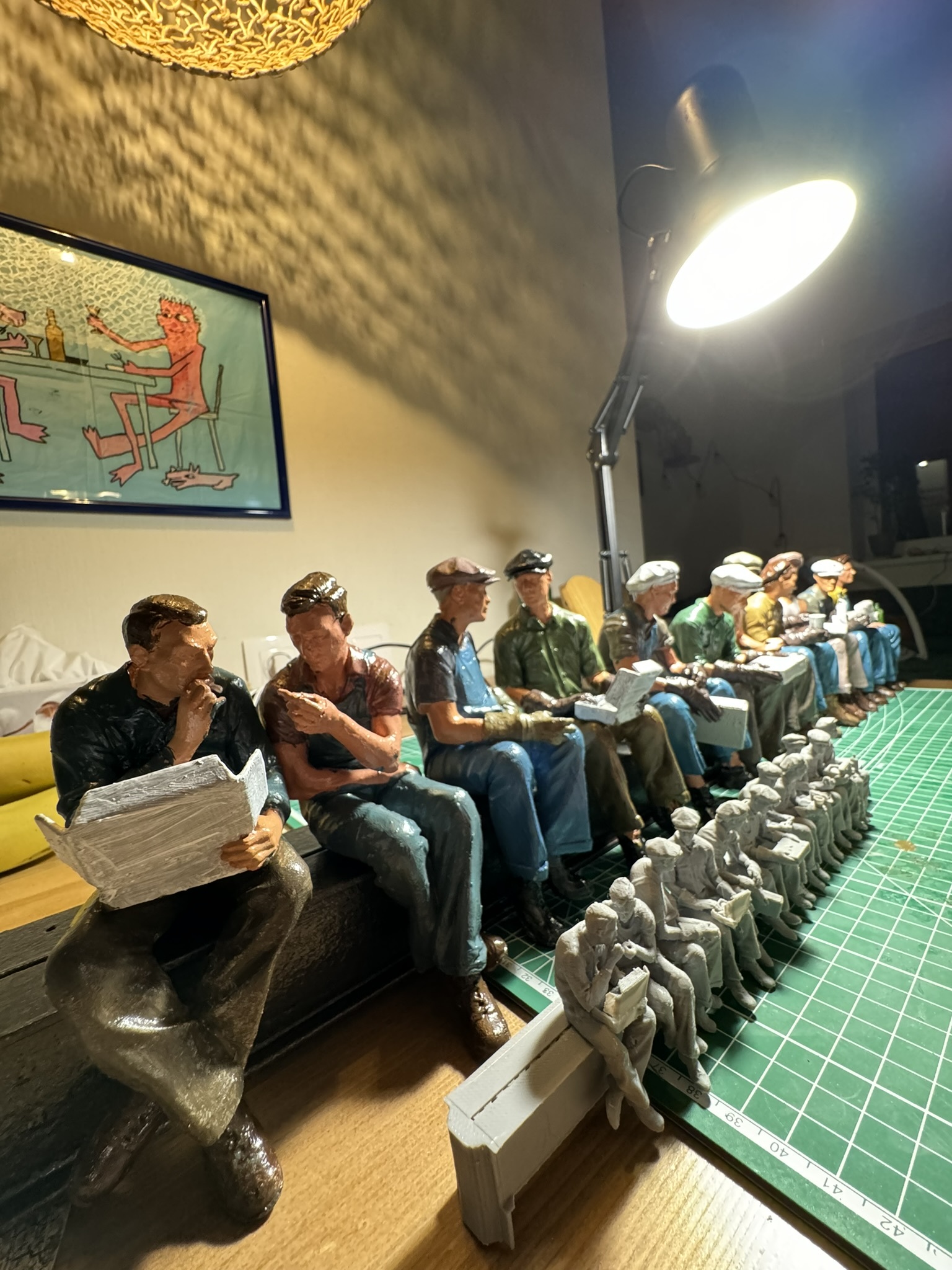 Давным давно увидел у знакомого в профиле интересную вещь на фото. Это была скульптура по знаменитой фотографии "обед на небоскребе" Она была очень дорогой и сделана из литьевого камня... С тех самых пор меня не покидала мечта - заполучить сие чудо. А еще лучше, чтобы это было не просто подвесной скульптурой, а светильником для рабочего места! Но то руки не доходили до реализации, то утыкался в проблемы с моделированием по фото....