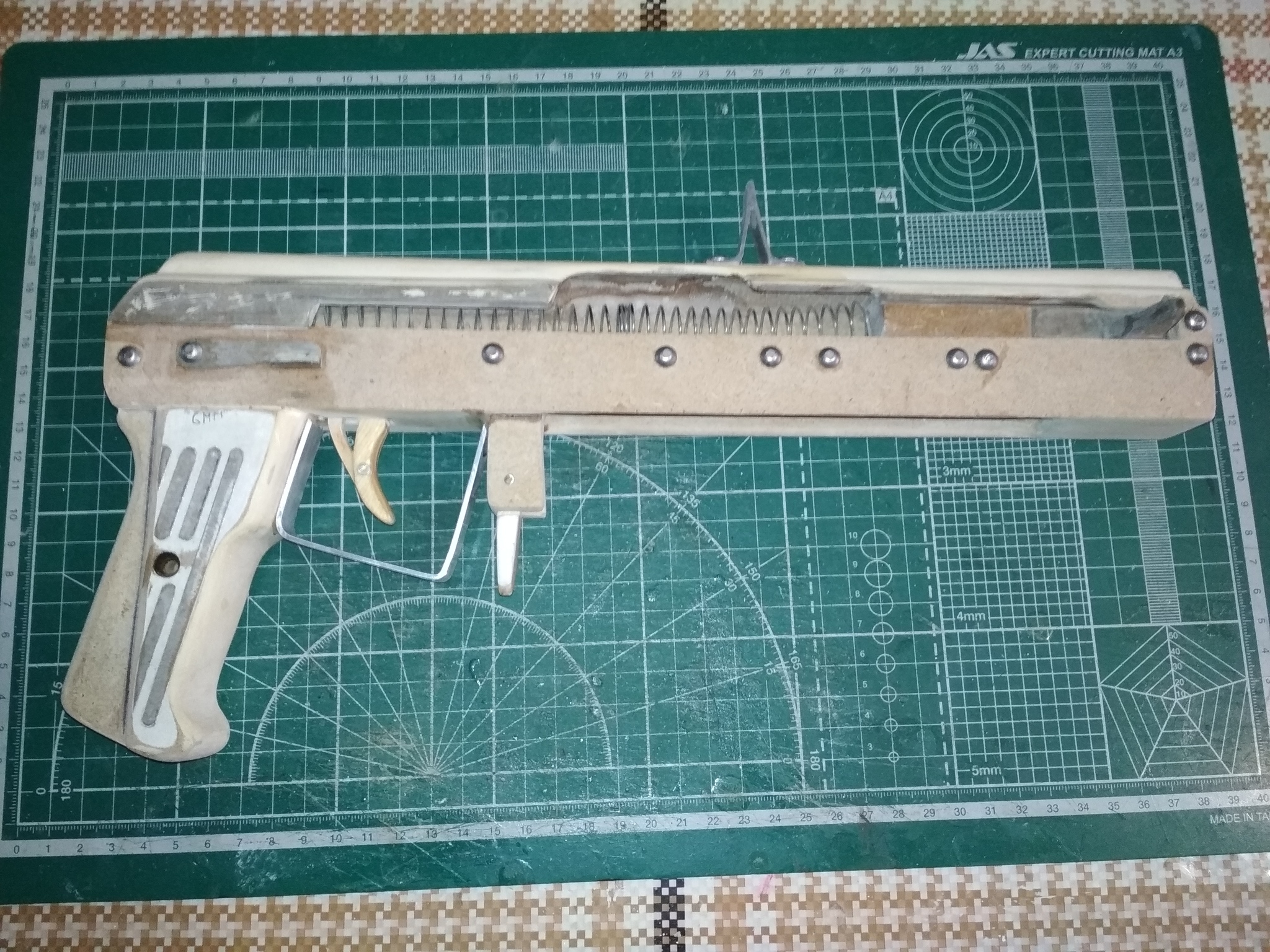 Ствольная коробка состоит из 5 слоев мдф (первые 3 слоя - 8мм, боковые - 6мм). Рукоять является единым целым с корпусом. из механизмов - двигающийся спуск, защелка магазина и имитация затворной рамы. Магазин идет трехслойный , с утолщениями из 1мм картона и 2мм пвх пластика.