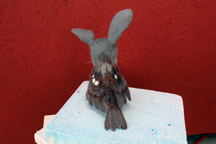 Поступил интересный заказ, а я и рада стараться, моя специфика. Чудные звери - мой конёк. Сваляла из шерсти, в ушах проволока, чтоб гнулись, в лапах тоже, но прочнее. Перья из фетра вырезали и обработала пропиткой, чтоб были твердые.