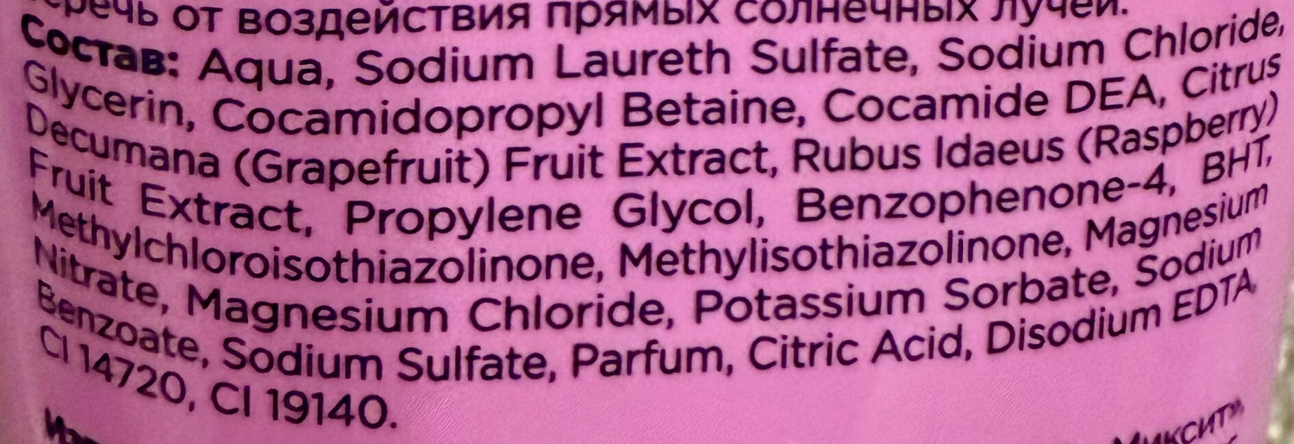 1.Aqua. Вода. Вспоминаем про 97% натуральных ингредиентов. Бегло смотрим дальше - там дальше всё химия. Верим. Получается, что гель на 97% состоит из воды. Ну ладно, на 95, т.к. нам еще экстракты грейпфрута и малины обещали.