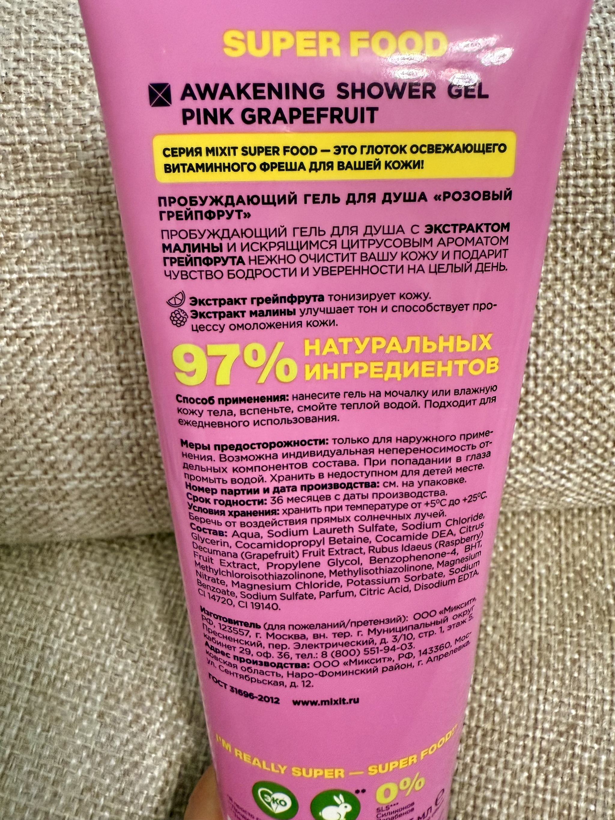 С едой разобрались. Теперь смотрим на лицевую сторону. 97 % ингредиентов натуральные. Без силиконов, парабенов и слс. Вот это и проверим. Переворачиваем.