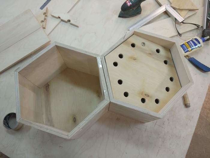Три стенки одинакового размера пилим на торцовочной пиле., а фронтальная и задняя - распиленный практически пополам шестиугольник.