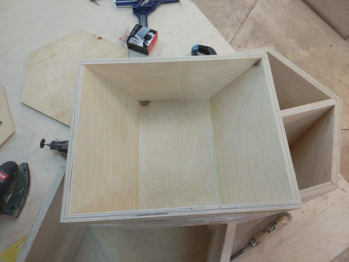 Ремарка: Я делал в стенках выборку в половину толщины фанеры так, чтобы заднююстенку воткнуть внутрь. Поэтому у меня и задняя стенка на 15мм уже.
