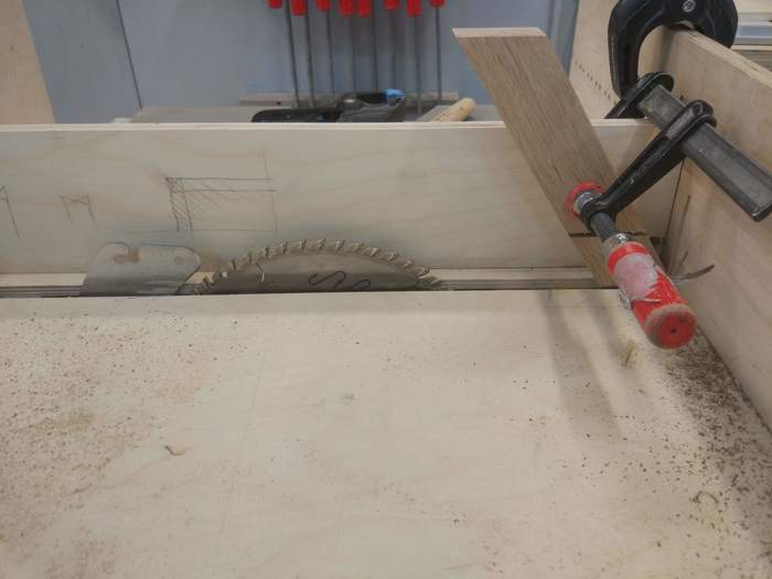 Далее на станке отпиливаем последний угол. Можно было все сделать с помощью торцовочной пилы, но так мне проще попасть в размеры.