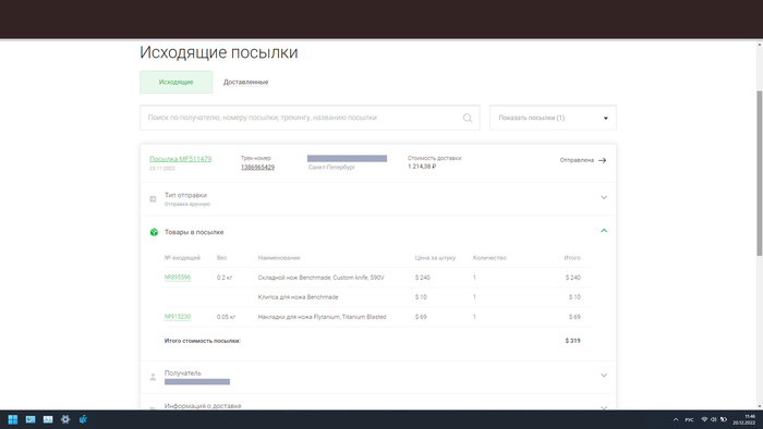 Получив утвердительный ответ, заказал в США складной нож и накладки к нему. Когда товар прибыл на склад в Нью-Касле, дождавшись, когда обработают и зарегистрируют посылку, оформил заказ и оплатил доставку в Санкт-Петербург.
