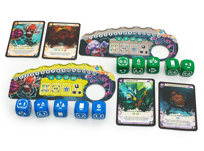 Очень важная деталь: никакие карты, что с постоянными эффектами, что с одноразовыми, после разыгрывания не отправляются в стопку сброса. Они выкладываются вдоль планшета, при этом, игрок не может разыгрывать карту, если ему не хватает звездочек (колдовской силы). Собственно, в начале игры, прежде чем расхватывать жетоны стихий или доп. карты при выпадении кубиков, следует озаботиться сбором этих самых звёздочек, поскольку каждый участник начинает с гордым нулём баллов колдовской силы, т.е. без права разыгрывать карты вообще. О чём чётко указано на планшете. Так же на планшете указаны доступные штрафные бонусы. Трижды за игру участник может: либо поменять два жетона одной стихии на два жетона другой, либо получить доступ на рынок, либо увеличить колдовскую силу на 1 балл (звёздочку), либо взять две карты, сбросив затем одну из них. Бонусы можно брать в любом порядке, никто не запрещает брать одинаковые бонусы несколько раз. Однако активация каждого эффекта накладывает штраф, снижающий общее число очков победы. За первый бонус штраф будет четыре кристалла, за второй – девять, за последний - уже минус пятнадцать баллов. Дополнительно в правом нижнем углу каждого планшета имеется большая круглая дырка, она нужна… я так и не понял для чего.