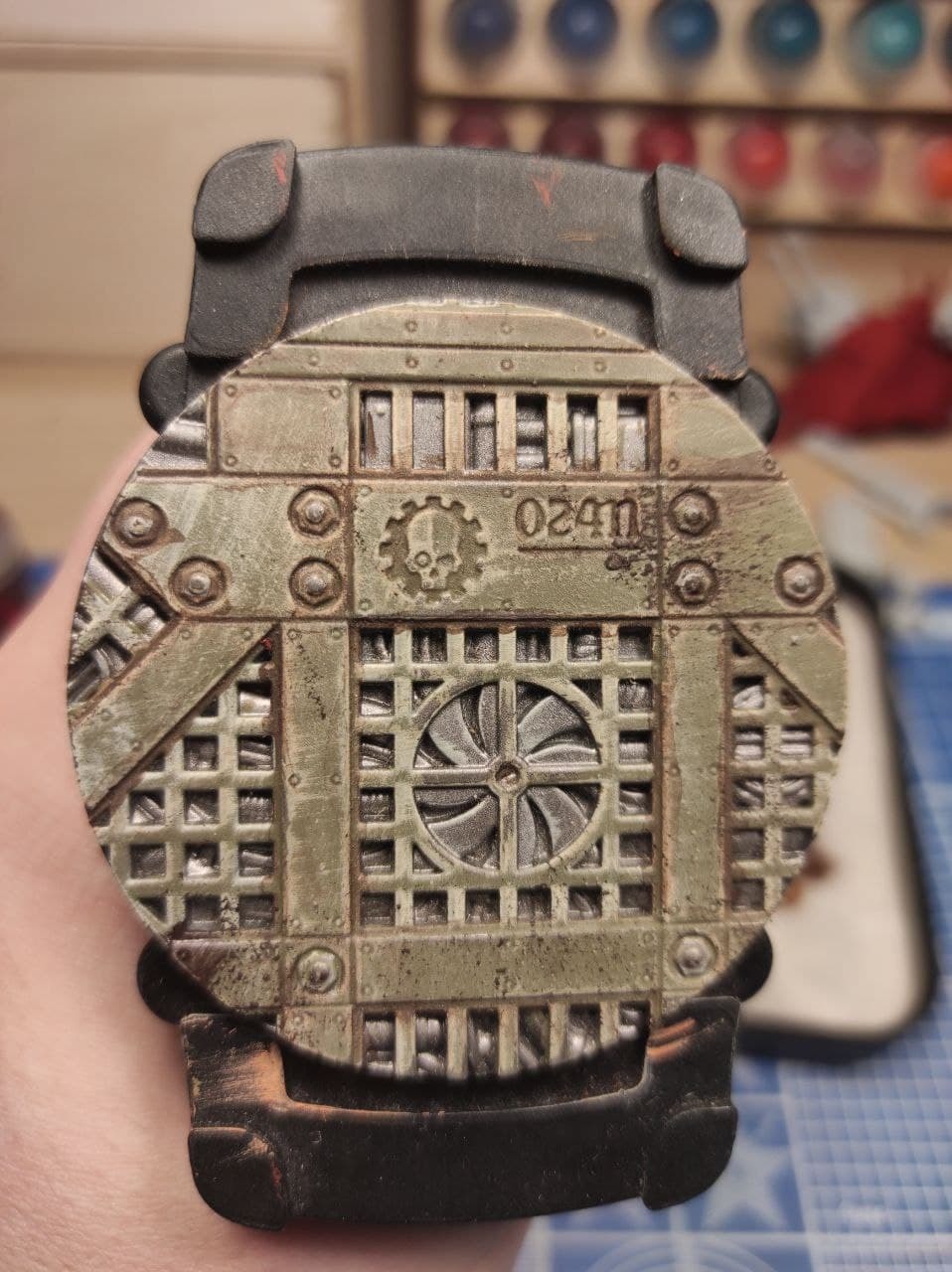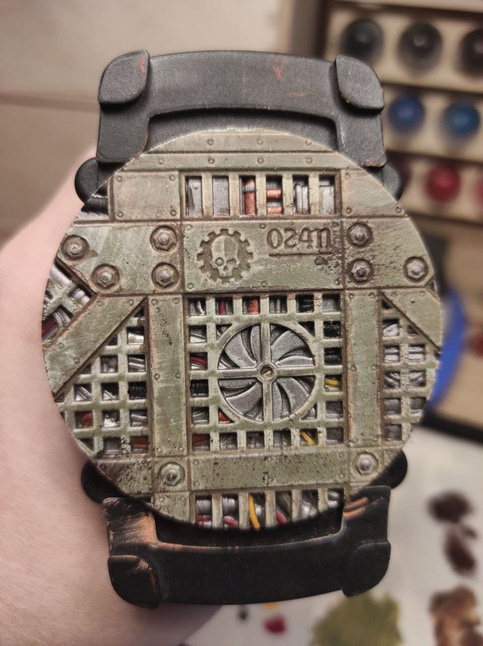 Далее для цвета и антуража красим в разные цвета трубы и провода внутри. Я использовал следующие краски: abaddon black, balthasar gold, averland sunset, khorne red.