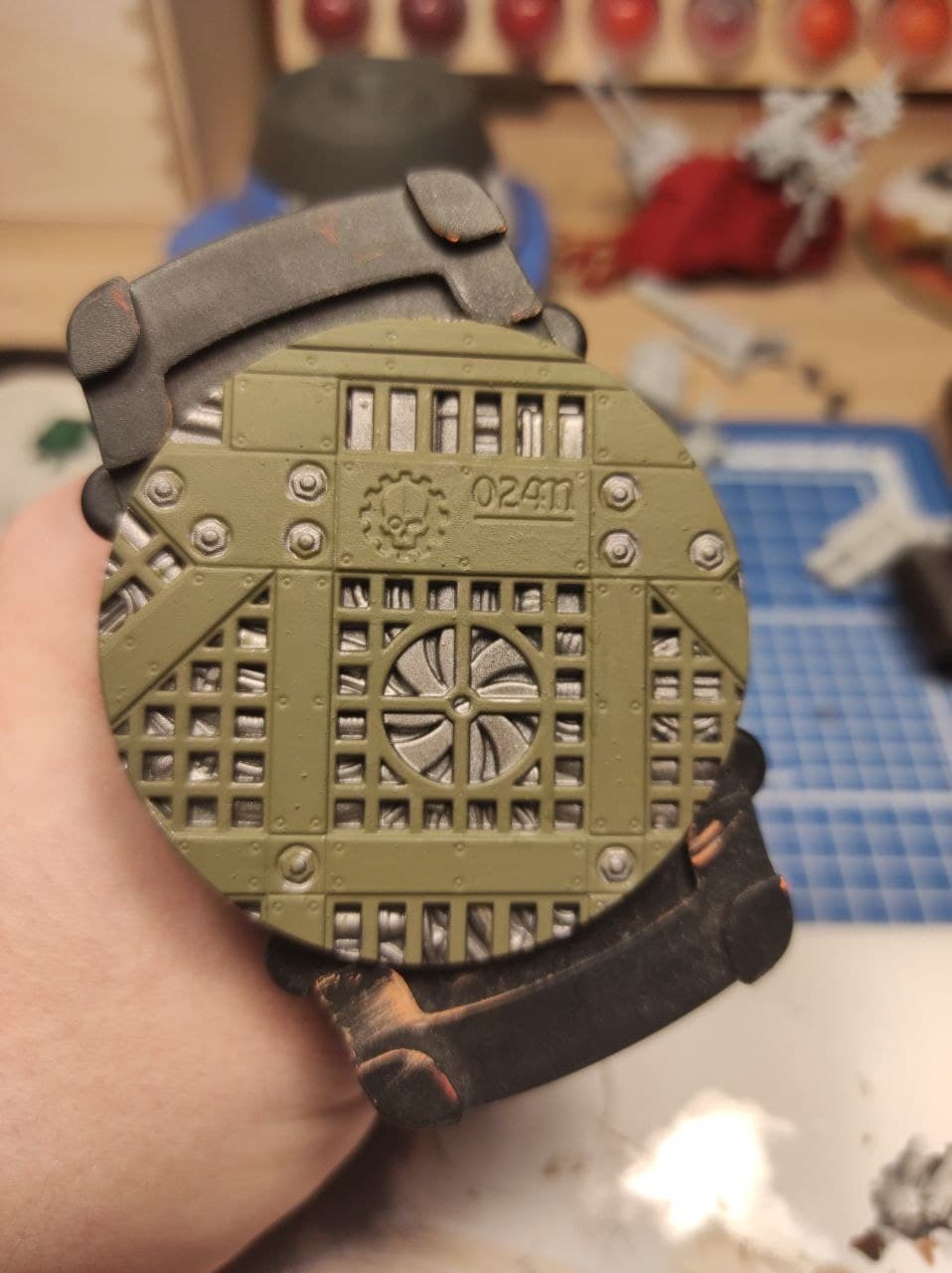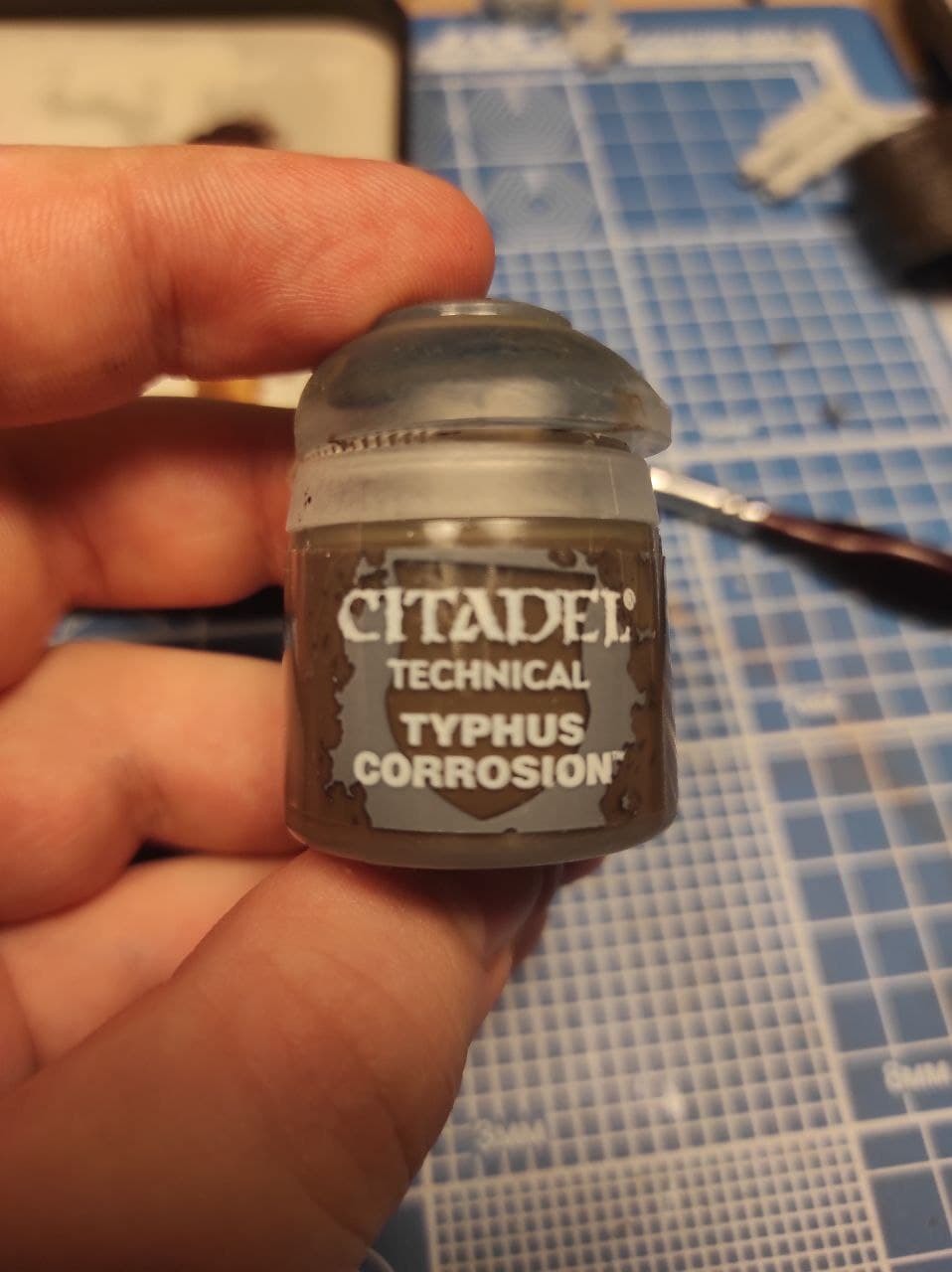 После этого во все углубления между плитами аккуратно заливаем техничку - typhus corrosion. И сразу избытки протираем обычной салфеткой. Так получается интересный эффект ржавчины и потертости. Так же берем губку, которую макнули в rhinox hide, и легонько тыкаем в базу, опять же для эффекта ржавчины и потрескавшейся краски.