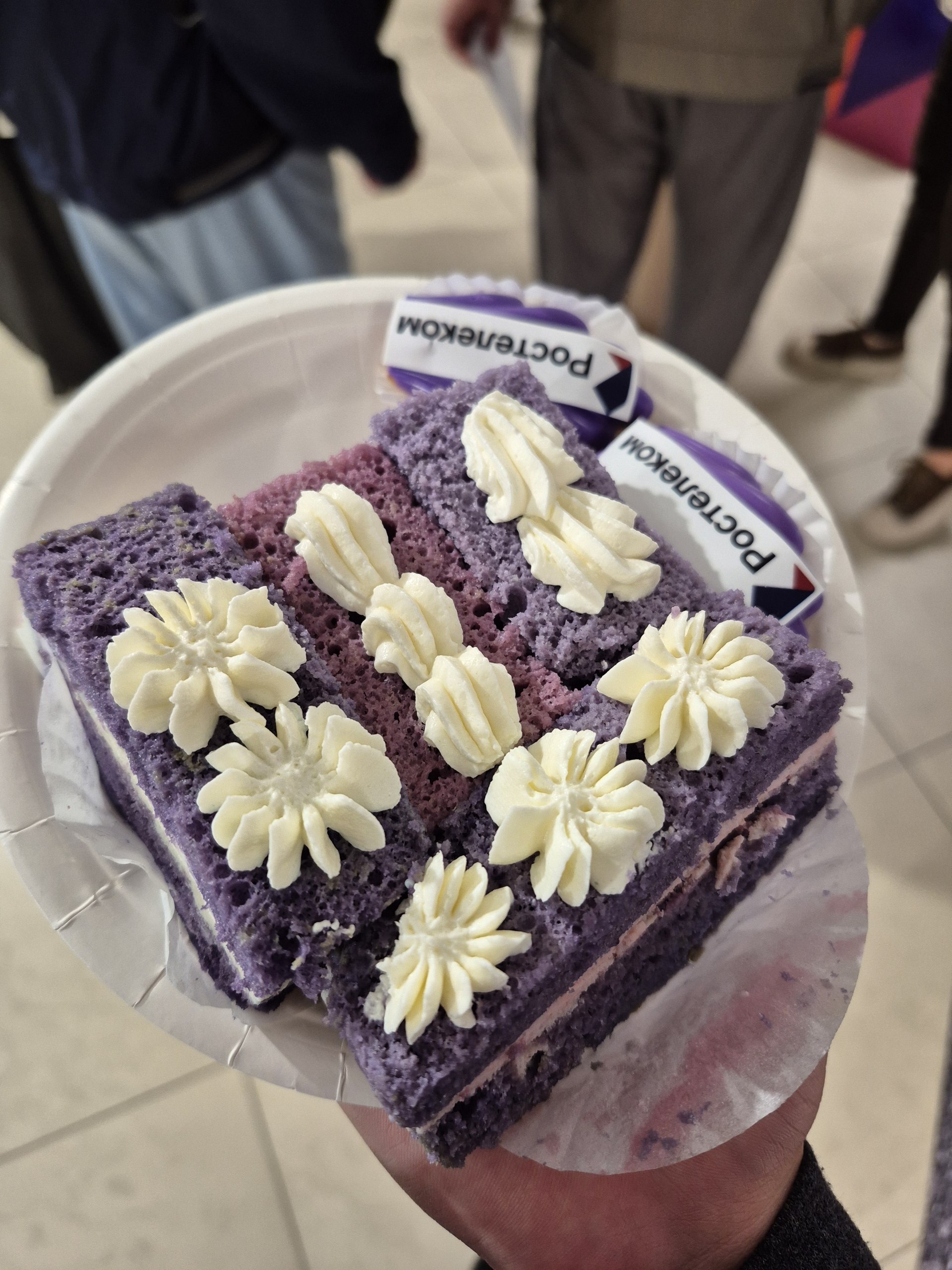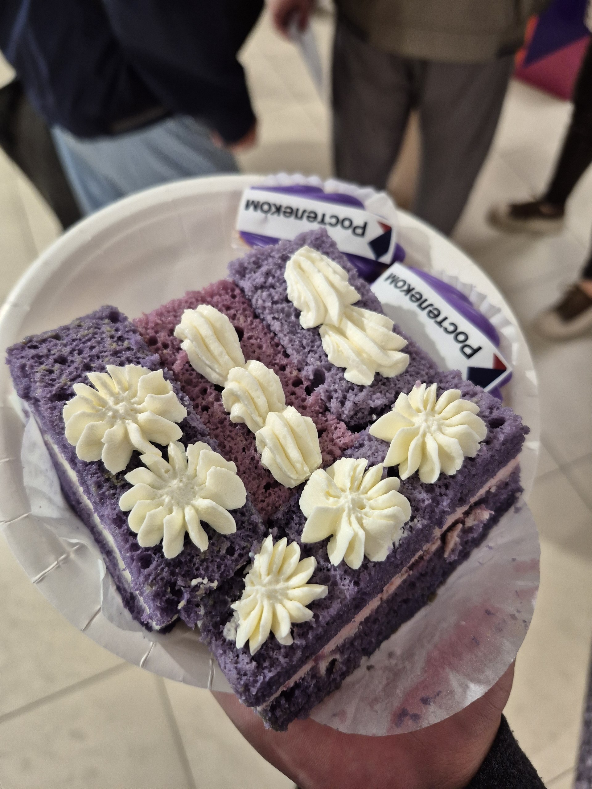На фото: наш фирменный фиолетовый торт (вкусно и красиво!) и праздничная фотозона с лозунгом «Дело в людях» — потому что именно вы делаете компанию по-настоящему сильной и человечной. ❤️
