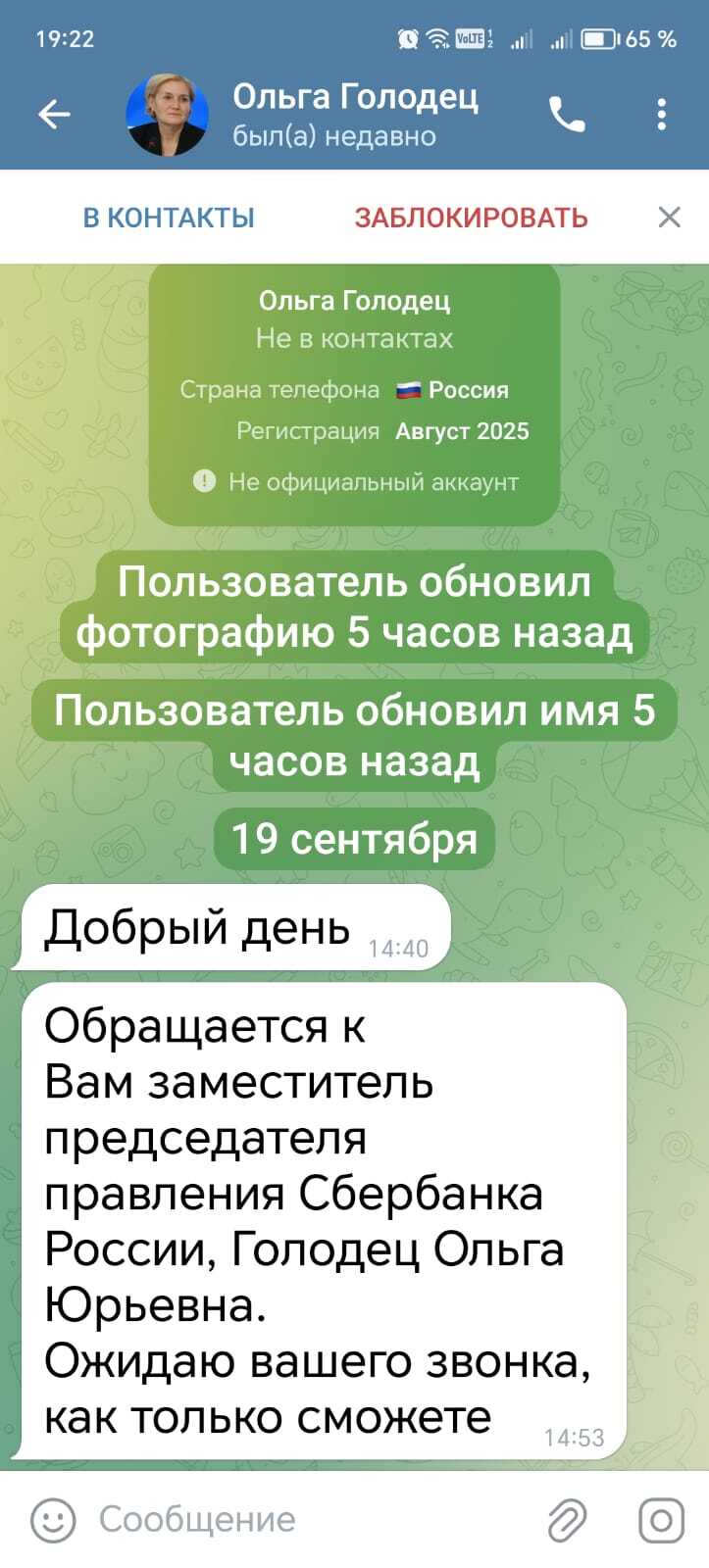 Сегодня в Телеграмм мне написала Ольга Голодец, заместитель председателя правления СберБанка. Правда 5 часов назад поменяла фото профиля и имя. Просит срочно позвонить.. Столько всего захотелось сказать.. Не знаю с чего начать. Может, у кого есть предложения?