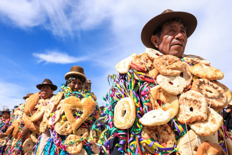 В Перу местные жители обвешались булками, чтобы привлечь изобилие в Новом году.