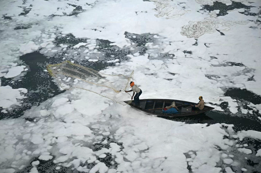 В Индии так и не смогли очистить реку, поэтому рыбаки пошли ловить рыбу в такой.