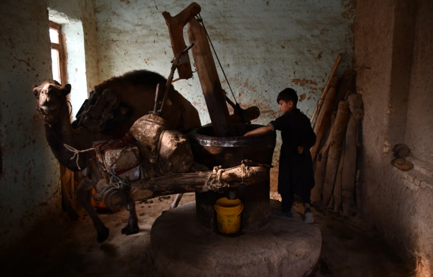 В Афганистане мальчик с помощью верблюда приготовил масло из семян кунжута.