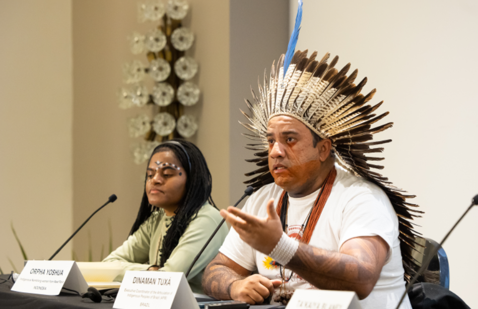 Бразильский индеец-юрист Динамам Тукса выступил на конференции по биоразнообразию в Канаде. На табличке его имя написали с ошибкой.