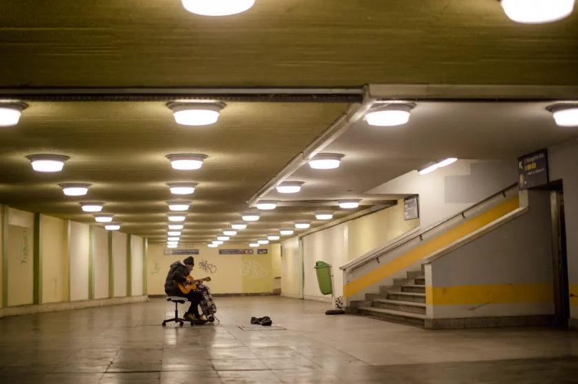 В Венгрии бездомный пытается заработать немного денег в метро.